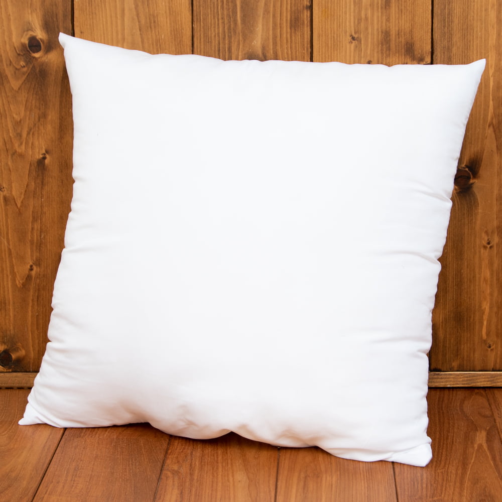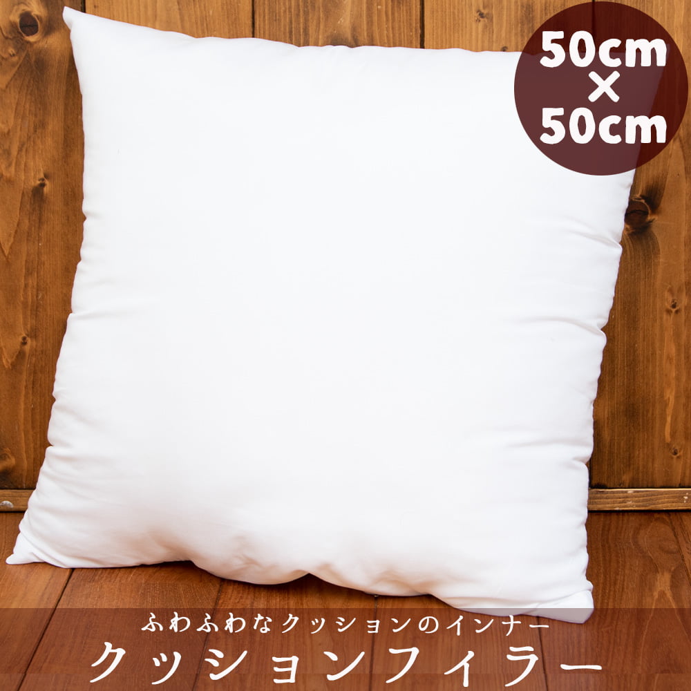 50cm x 50cmの大きさのヌードクッションです。当店で売っているほとんどのクッションカバーにぴったりフィットするおてごろサイズ。素材はポリエステルなので扱いやすくなっています。お届けする時は真空状態でバキュームパックされていますので、ハサミ等でビニールを切って取り出してお使いください。一度大きくなるとふわふわ!!