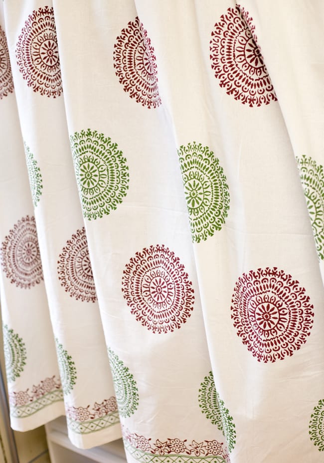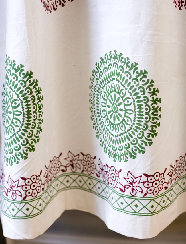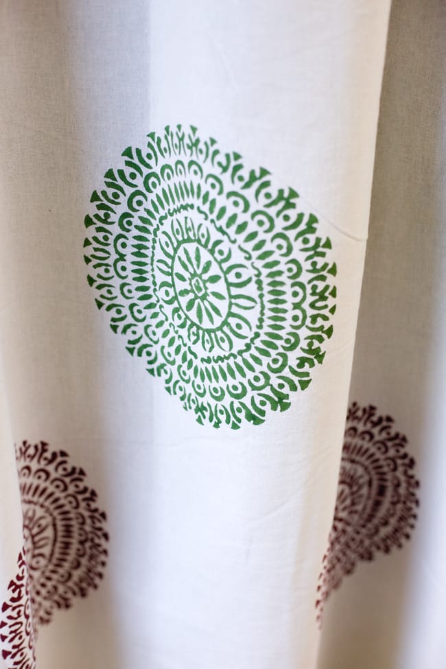 こちらのカーテンは綺麗で爽やかな白色のインド綿に、温もりのあるウッドブロックプリントを施したカーテンです。ウッドブロックプリントは日本語で木版染めと呼ばれ、木を彫刻刀のような道具で彫り判子のような木版を作ります。その木版に様々な色のインクを付けて、手作業で一つづつ押していくとても時間と手間の掛かるものです。