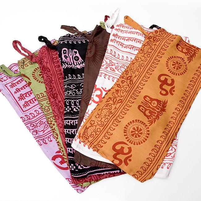 ラムナミと呼ばれるインドの特有の布で作られたかわいいポーチです。ラムナミとは、簡単に言うと「神様や柄の入った布」。それを現地では通称「ラムナミ」と呼んでおり、日常的にストールにして使ったりと愛されています。