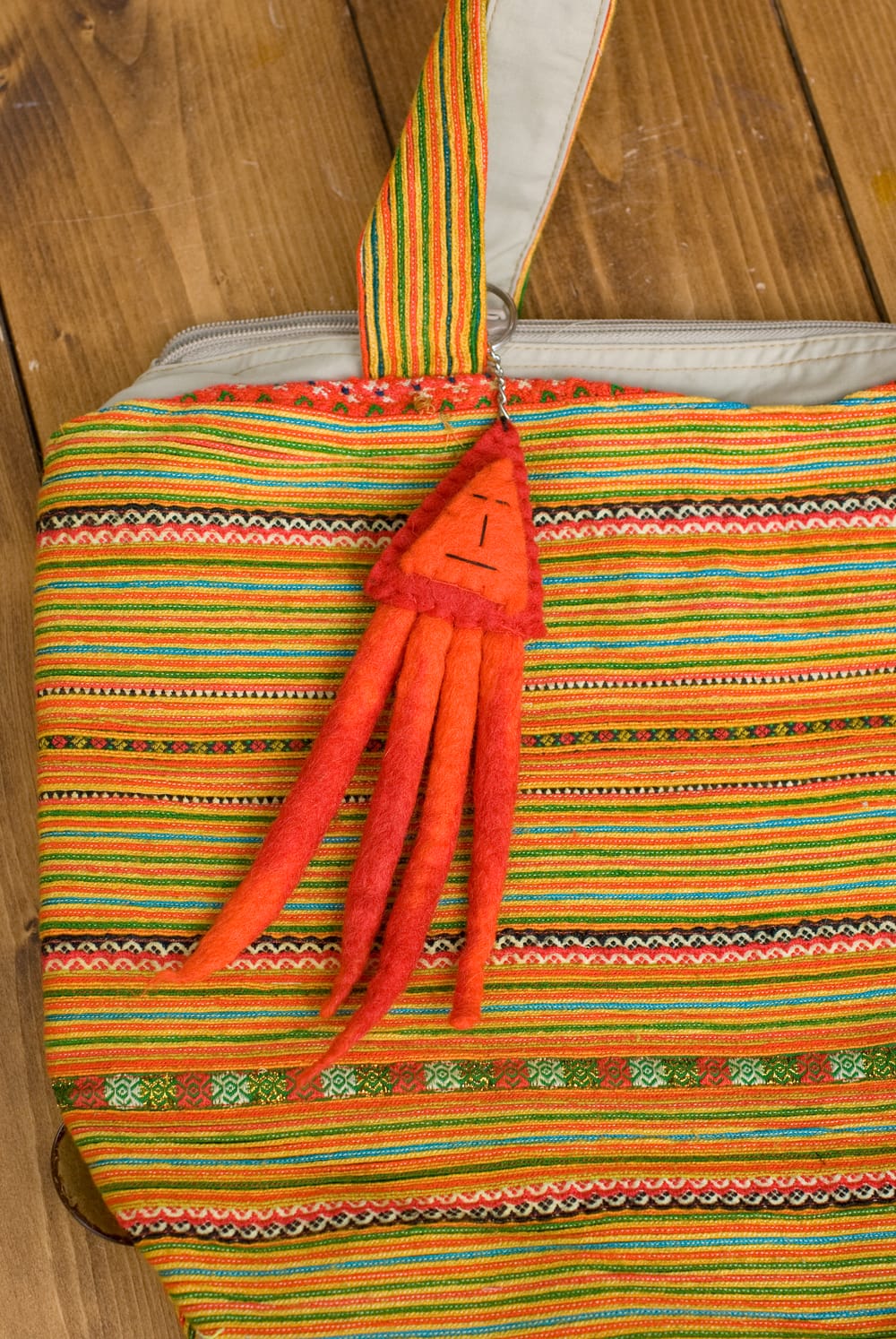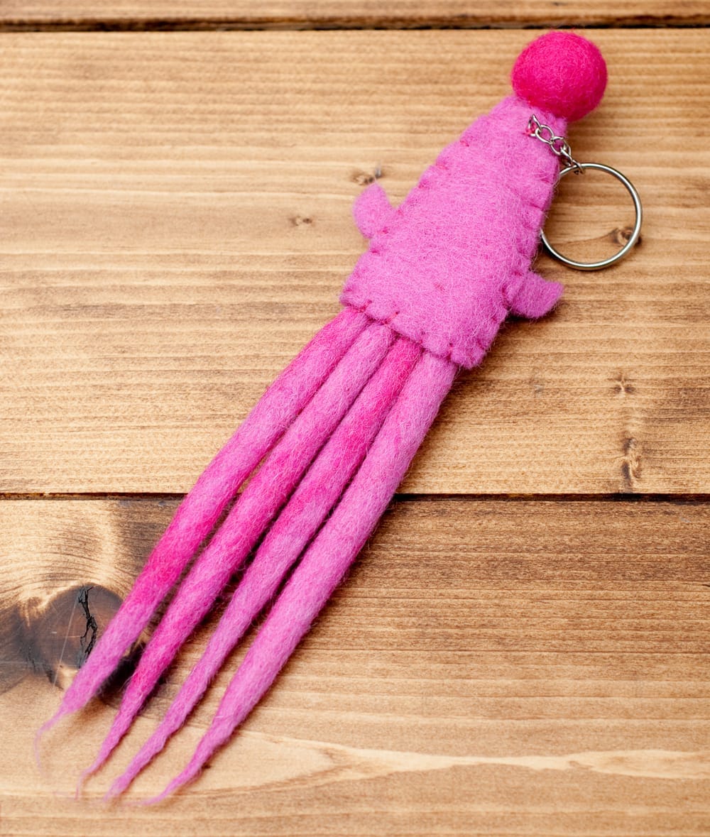 商品名には「イカ」と書いたのですが、実はなんだかよくわからないゆるキャラです。ネパールからやってきた時の商品名を見てみると「フェルトふろっぐ キーホルダー」と書いてありましたが…どこからどう見てもカエルではないですよね。よく見てみれば、愛着が湧いてきそうな、ニヒルな顔にすらっと背の高く何を模しているのかわからない容姿。貴方の携帯電話につけたり、バックや鍵につけて、貴方の相棒にいかがですか。目を引く事まちがいなしですよ。