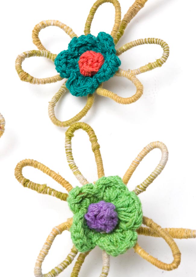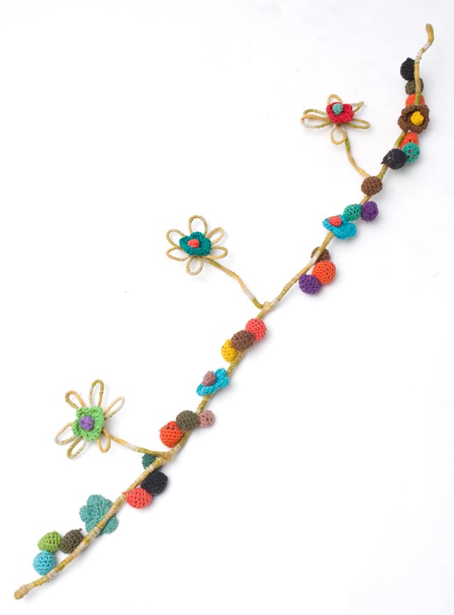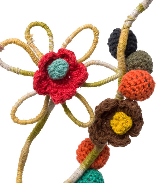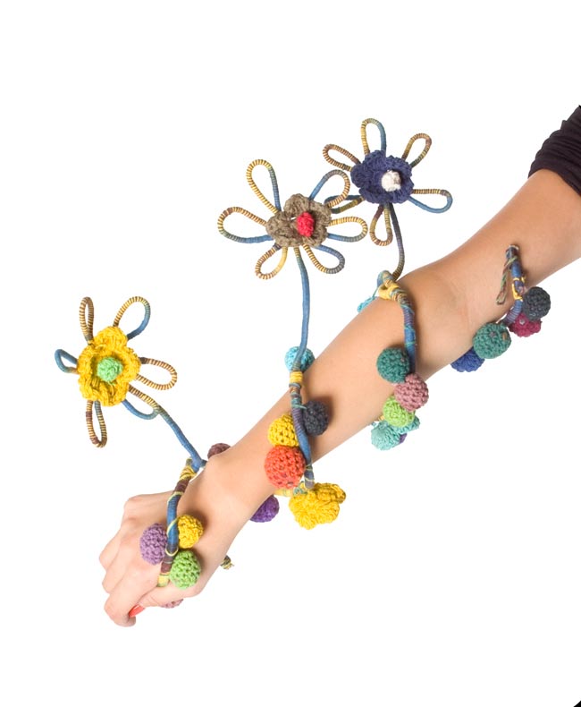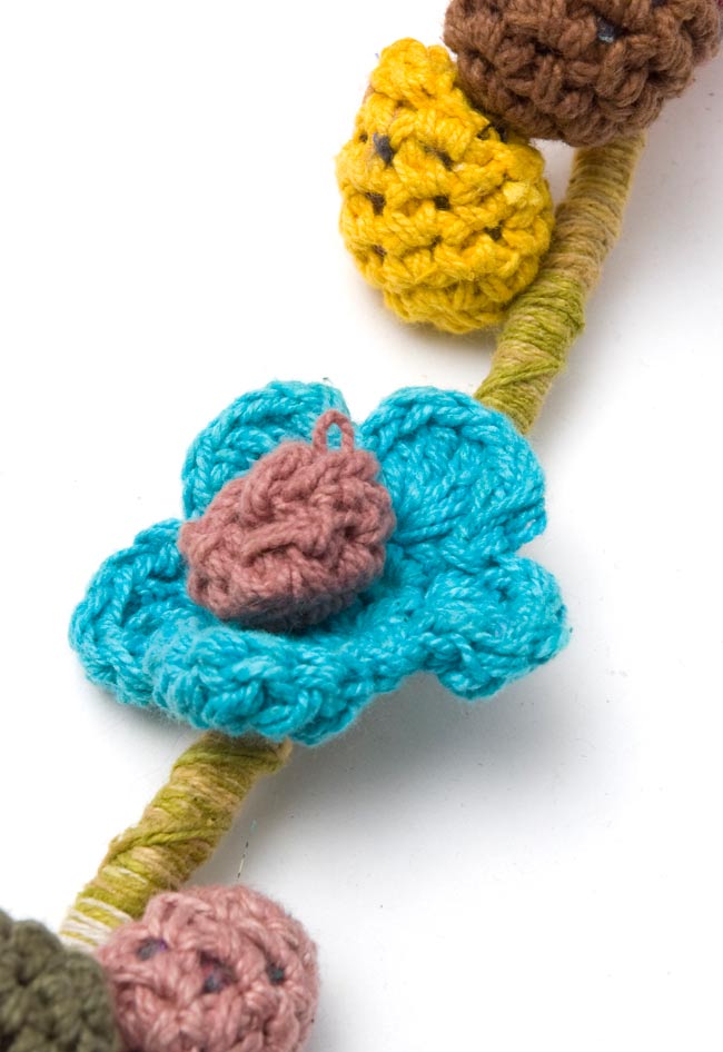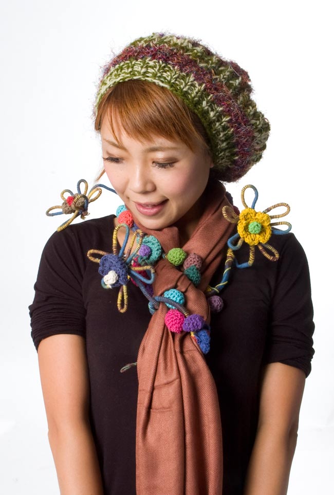 お花もポンポンも可愛いです。ポップそのものという感じ。涼しくなったら首に巻きたいです。