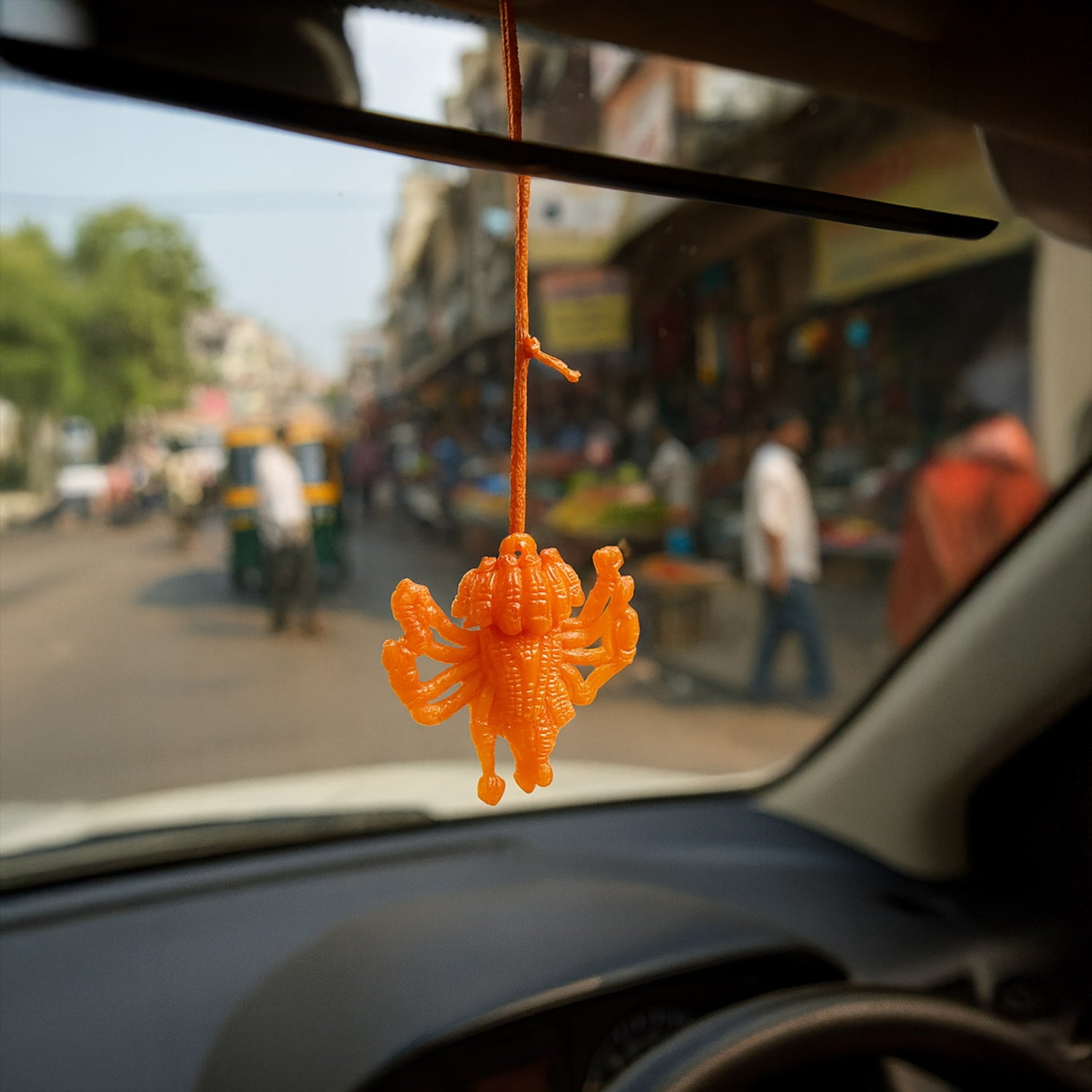このハヌマンをよく見かけるのは、車のバックミラーの下でしょうか。バックミラーにぶら下げられて、ハヌマーンがゆらゆらと揺れているのをよく目にします。他にも電気のスイッチ紐にぶら下げられていたり、インドの様々なところで見かけます。