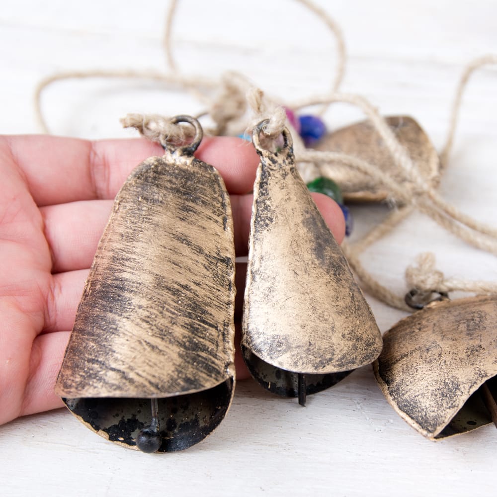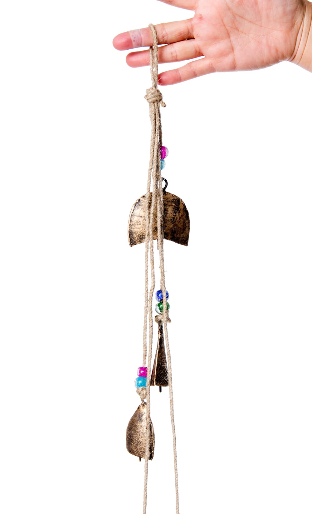 ドアチャイムなどへ!手作りのやさしい音色 インドの銅仕上げカウベル ハンギング - ゴールド5連貝風ベル〔約75cm〕 x 4個