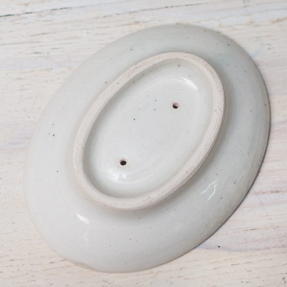 手書きペイントのソープディッシュが千円台で買えるのはお買い得だと思います。手書きペイントは、手作りならではの素朴さがあって素敵です。大きめのオリーブ石鹸も置けます。ただ、穴が2つしかないので、中心部分に少し水が溜まってしまいます。