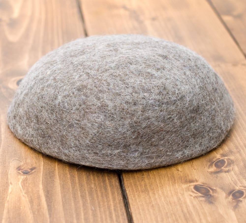 ウェットフェルト製法という特殊な方法で手作りされており、羊毛を丁寧に刈り取ったあと、石鹸と水を使って根気よくより合わすことで作られます。継ぎ目もなく、糸で縫ってもいないのが特徴です。
