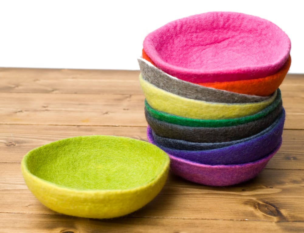 中に何も入れない時は重ねてコンパクトに収納ができて、カラフルなフェルトボウルがただ積み重なって置いてあるだけでも、お部屋を明るく素敵な雰囲気にしてくれそうです!