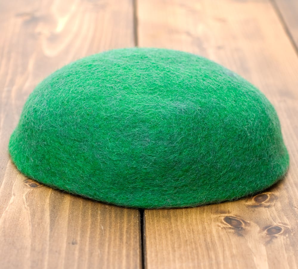 ウェットフェルト製法という特殊な方法で手作りされており、羊毛を丁寧に刈り取ったあと、石鹸と水を使って根気よくより合わすことで作られます。継ぎ目もなく、糸で縫ってもいないのが特徴です。
