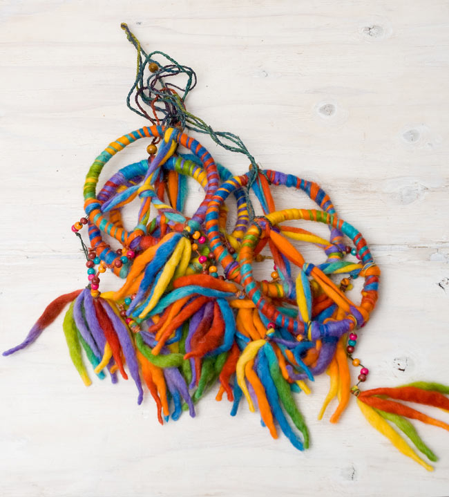 ヒッピーのシンボル、ピースマークのハンギングです。ヒマラヤの山麓でととれるワイルドヘンプ糸とカラフルなフェルトウール。さらに、優しく色付けされたウッドビーズで装飾されています。自然素材がミックスした素敵な一品です。■飾った場所がヒッピースタイルに