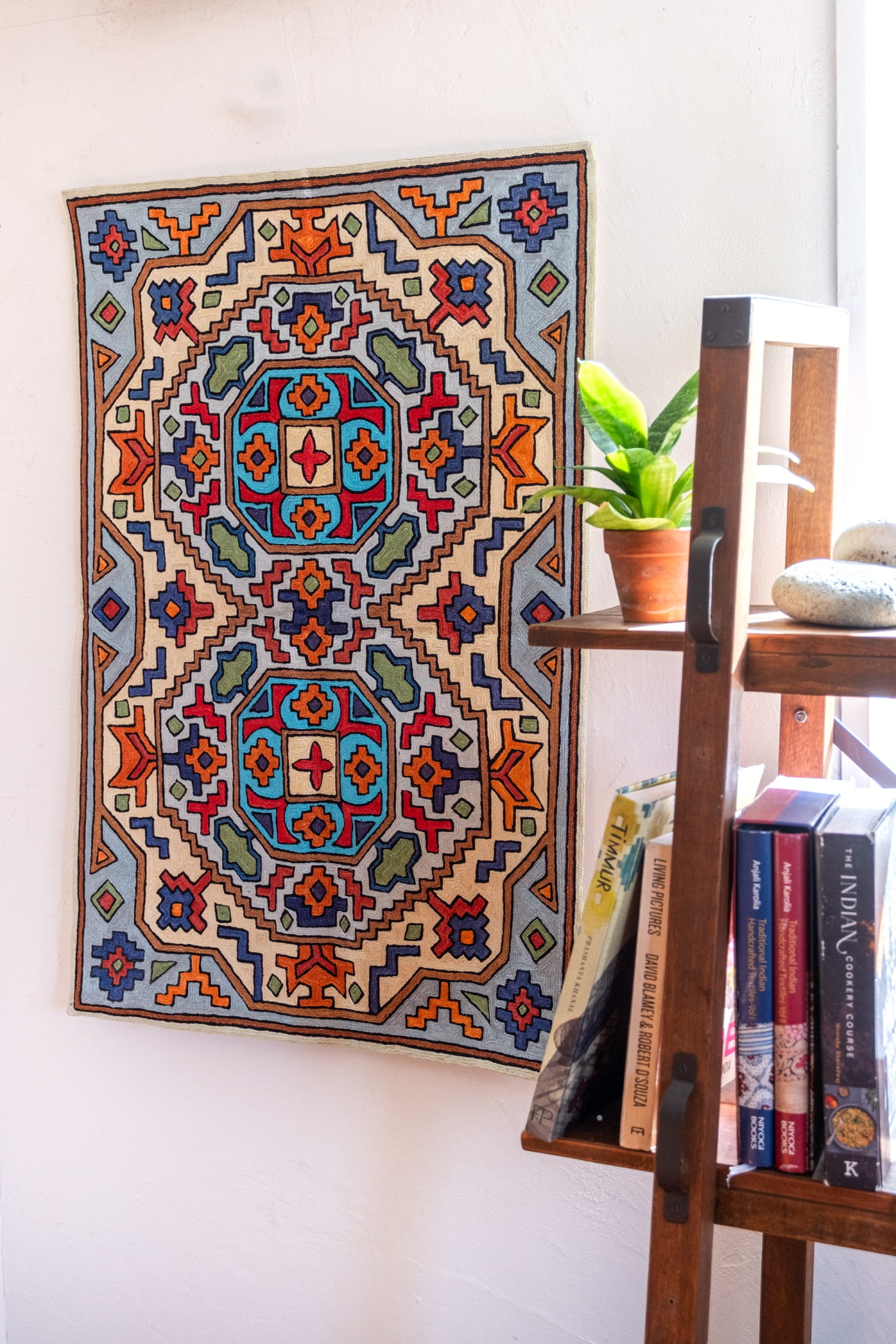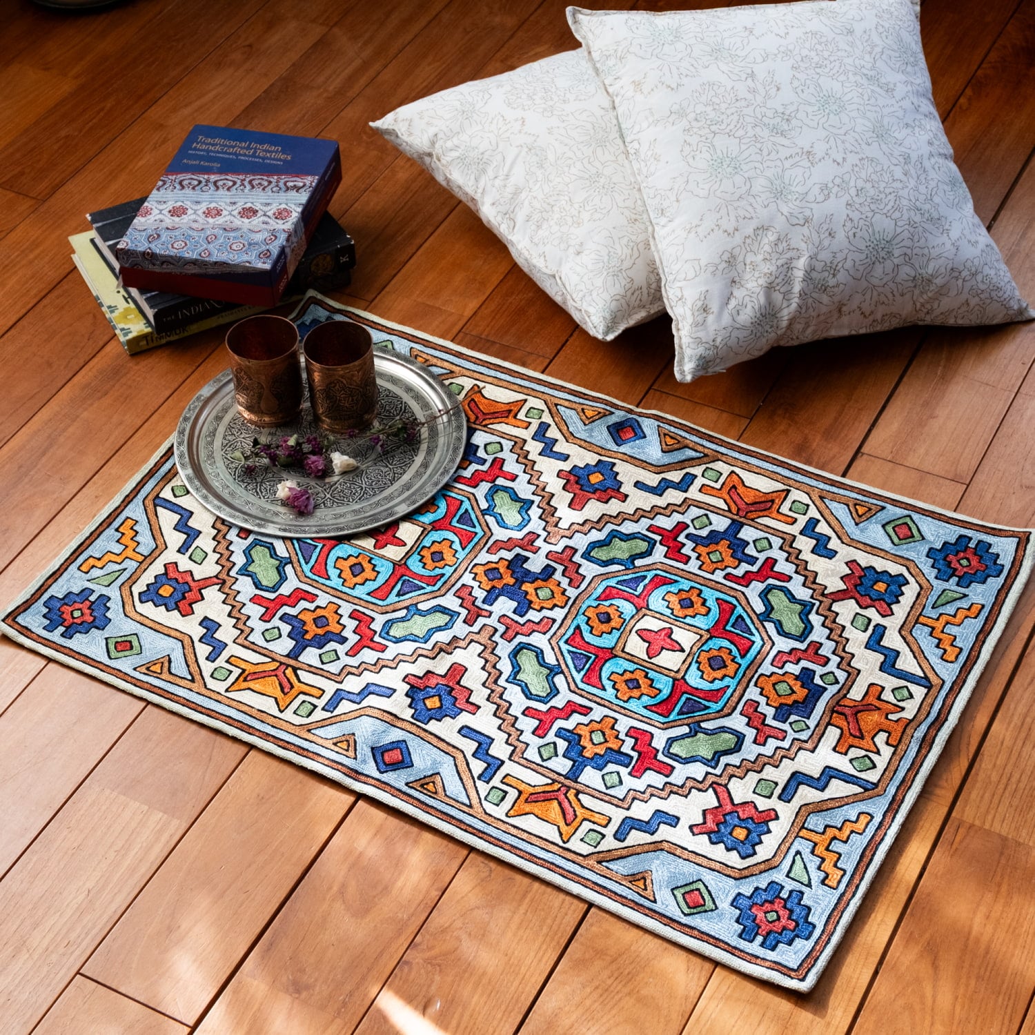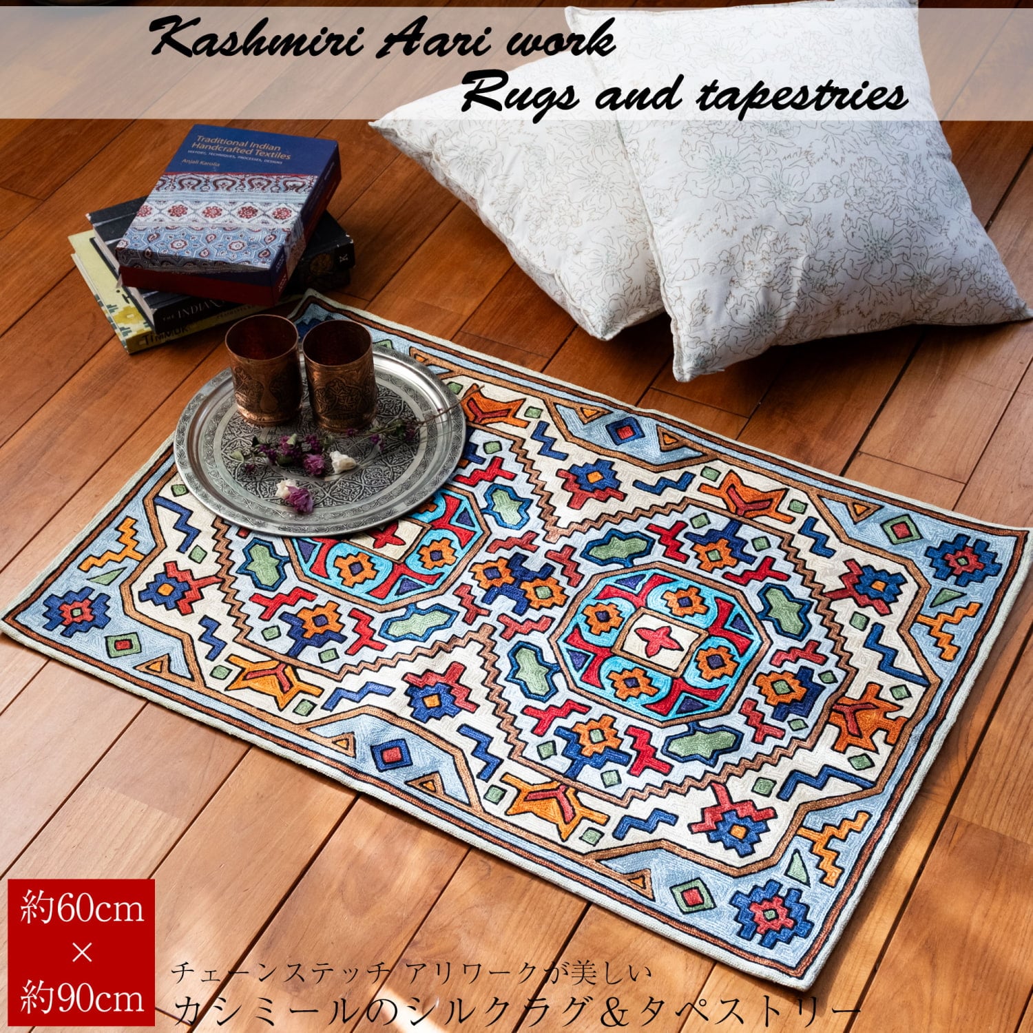 【1点物】チェーンステッチ アリワークが美しい カシミールのシルクラグ【約60cm x 90cm】 通販店