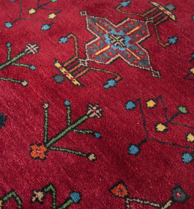 手織りのウール絨毯は、色合いもやさしく、質感もとっても良いので、様々な家具やお家に似合います。エスニックなお家はもちろん、北欧系や和風の畳なお部屋へもワンポイントとして違和感なく溶け込んでくれると思います。また、生地は触り心地がとっても滑らかで、ふわふわとしております。厚みも通常の絨毯と比べるとかなりあり、保温性や防音効果にも期待ができそうです。