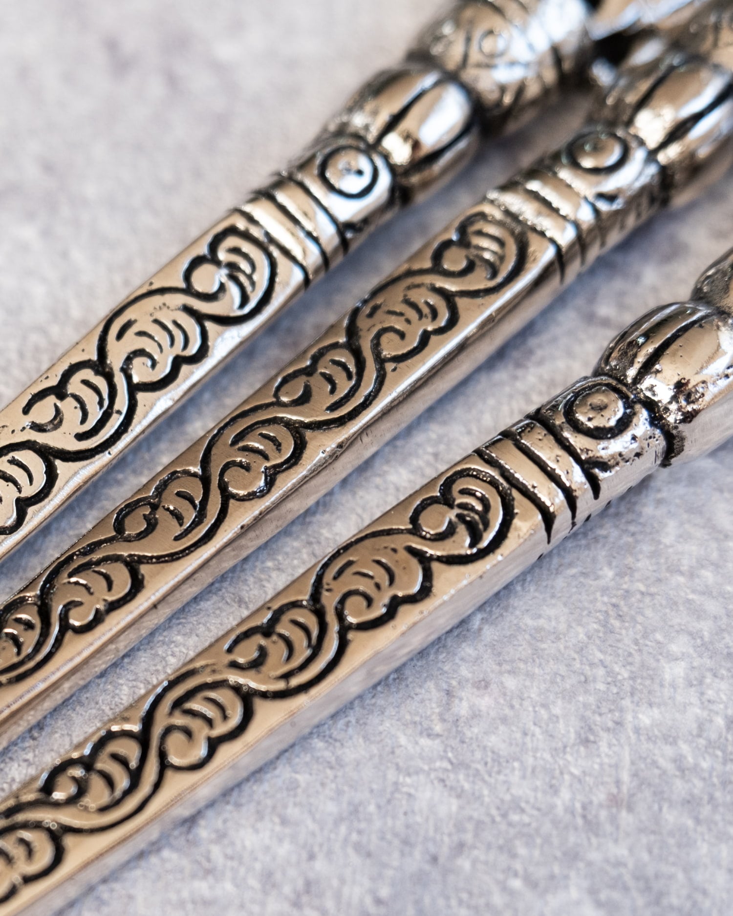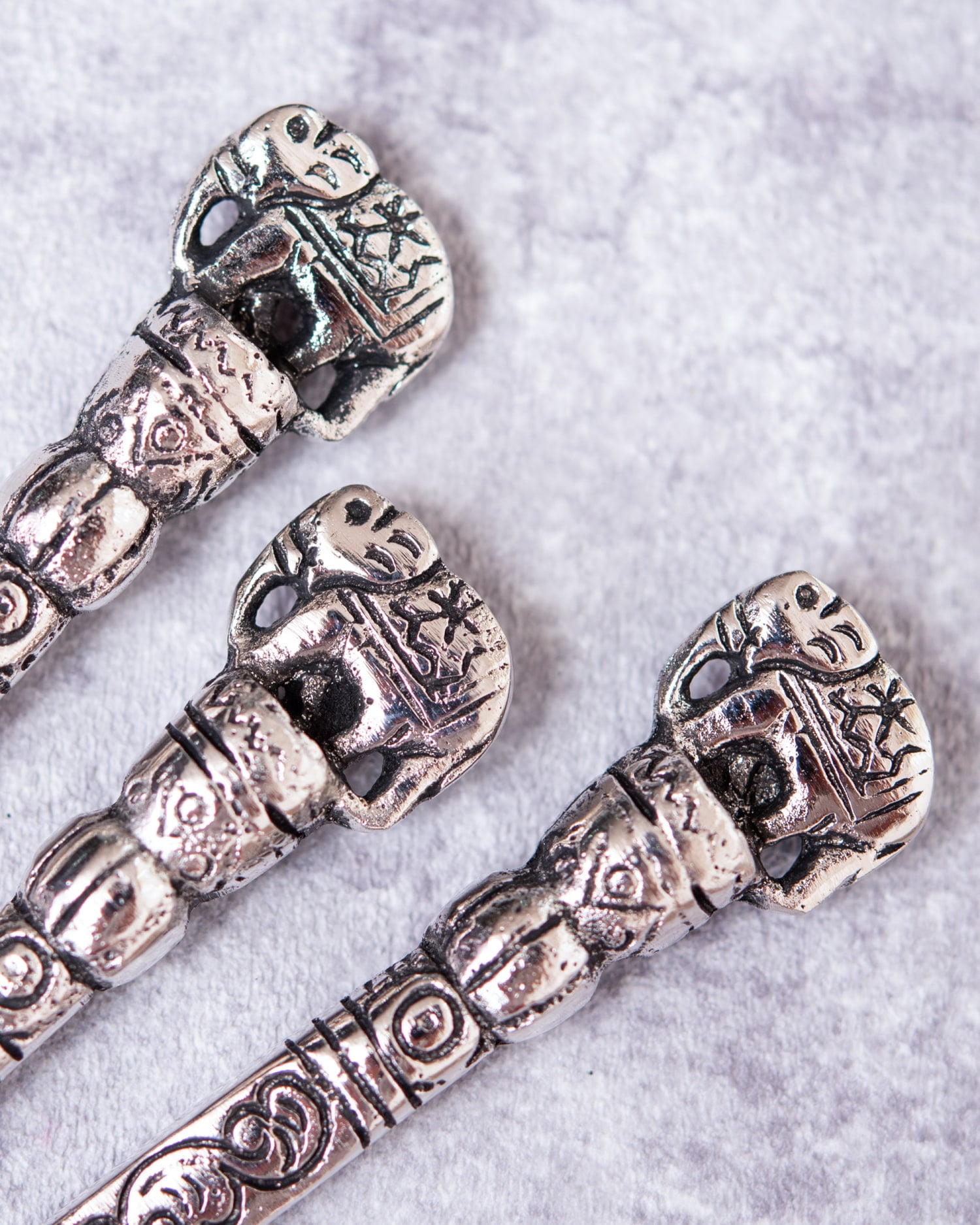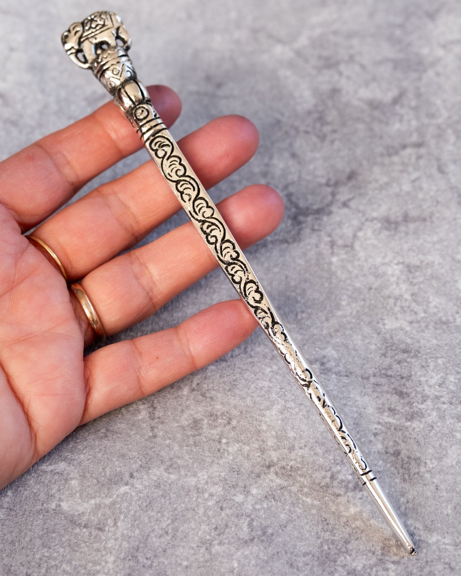 こちらもエスニック感満載で先っぽにチャラチャラと動く飾りがあるのが可愛いです。ただ柄の金属部分の先があまりきれいに処理されていなかったため髪に挿した時に引っ掛かてしまいました。先をやすりで少し研磨し使用しています。