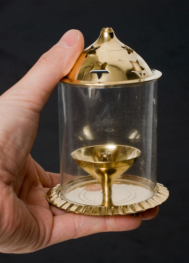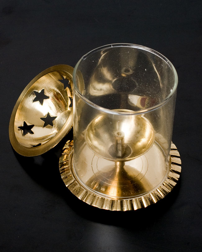 ガラスのカバー付きブラスのオイルランプ&香立てです。金色に輝くブラスに星のマークが施されています。オイルランプの火がガラスで隔てられているので、完全とはいかないけれども、そこそこ安全ですので、インドの家庭でずっと燃やし続ける火を灯したい祭壇用として使われています。■コットンと油で使用できます