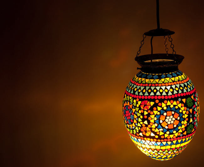 明かりを灯すと、カラフルな美しい光がポッと灯り、お部屋の中を異世界にしてくれます。電気をつけていなくても、かわいらしい柄で良いのですが、やはりランプは電気をつけてこそ。色とりどりのガラスで描かれた柄が暗闇の中に浮かびあがる様は、思わず感嘆の溜め息が漏れてします。■インドならではのランプシェード