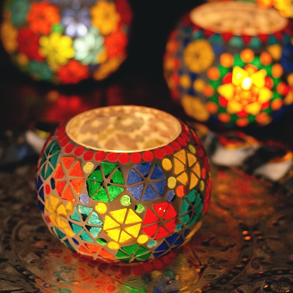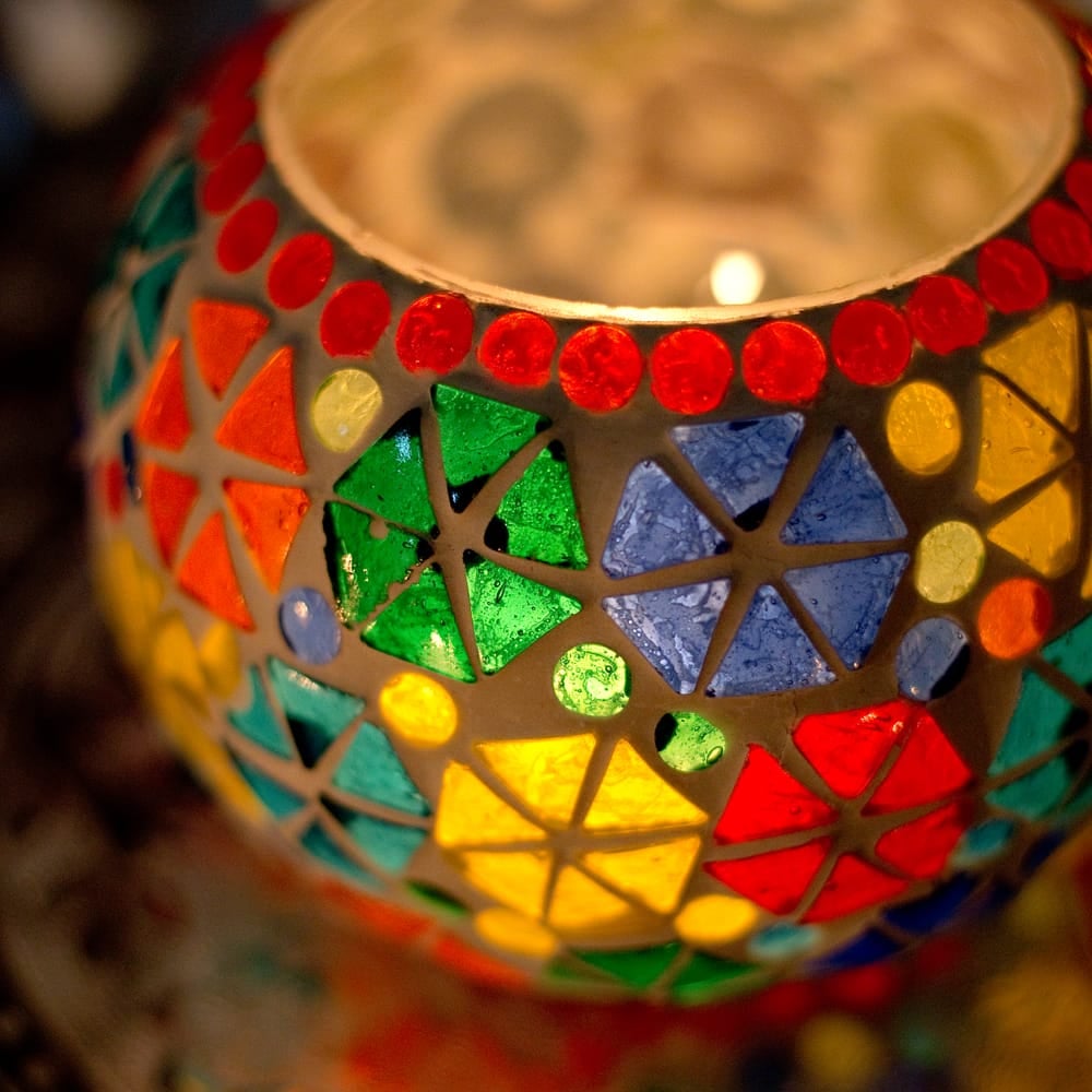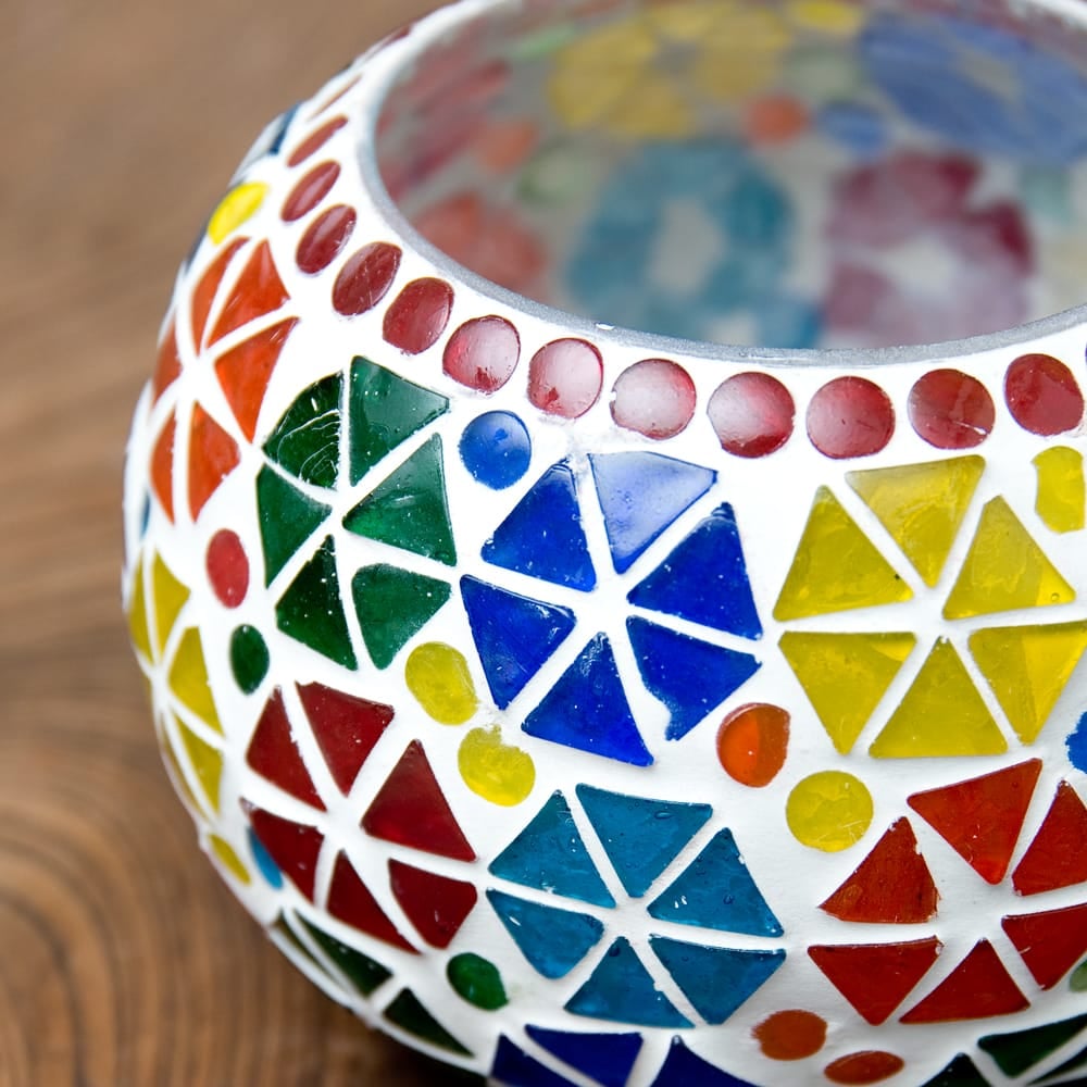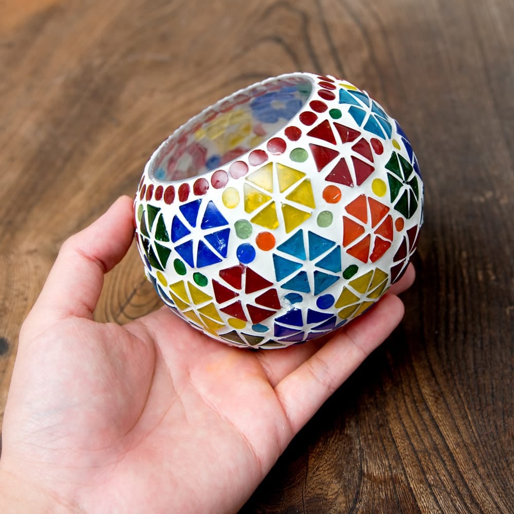 キャンドルを入れて暗い部屋で使うとカラフルなモザイク模様がとても綺麗に輝きます。