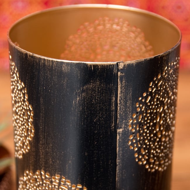 この幾何学模様の透かし彫りが美しいマンダラランプもまた、彼らの素晴らしい美意識が生み出した素敵な逸品です。黒い外側ですが、内側は金路に塗られ、美しい幾何学模様に空けられた穴からは、キャンドルを灯さずとも金色に光って見えます。