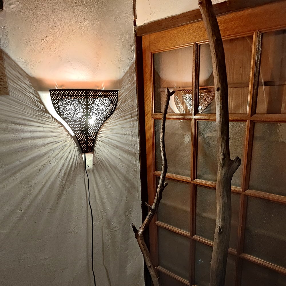 幾何学デザインを基調にした、素敵なモロカンスタイルのランプが、インドの金属の都モラダバードからやってきました。細かく空いた穴から漏れ出る光はとても綺麗です。ご自宅のお部屋に、お店のインテリアとしてもオススメです。遠い国からやってきたものではありますが、不思議と日本の家屋にもぴったりフィットします。