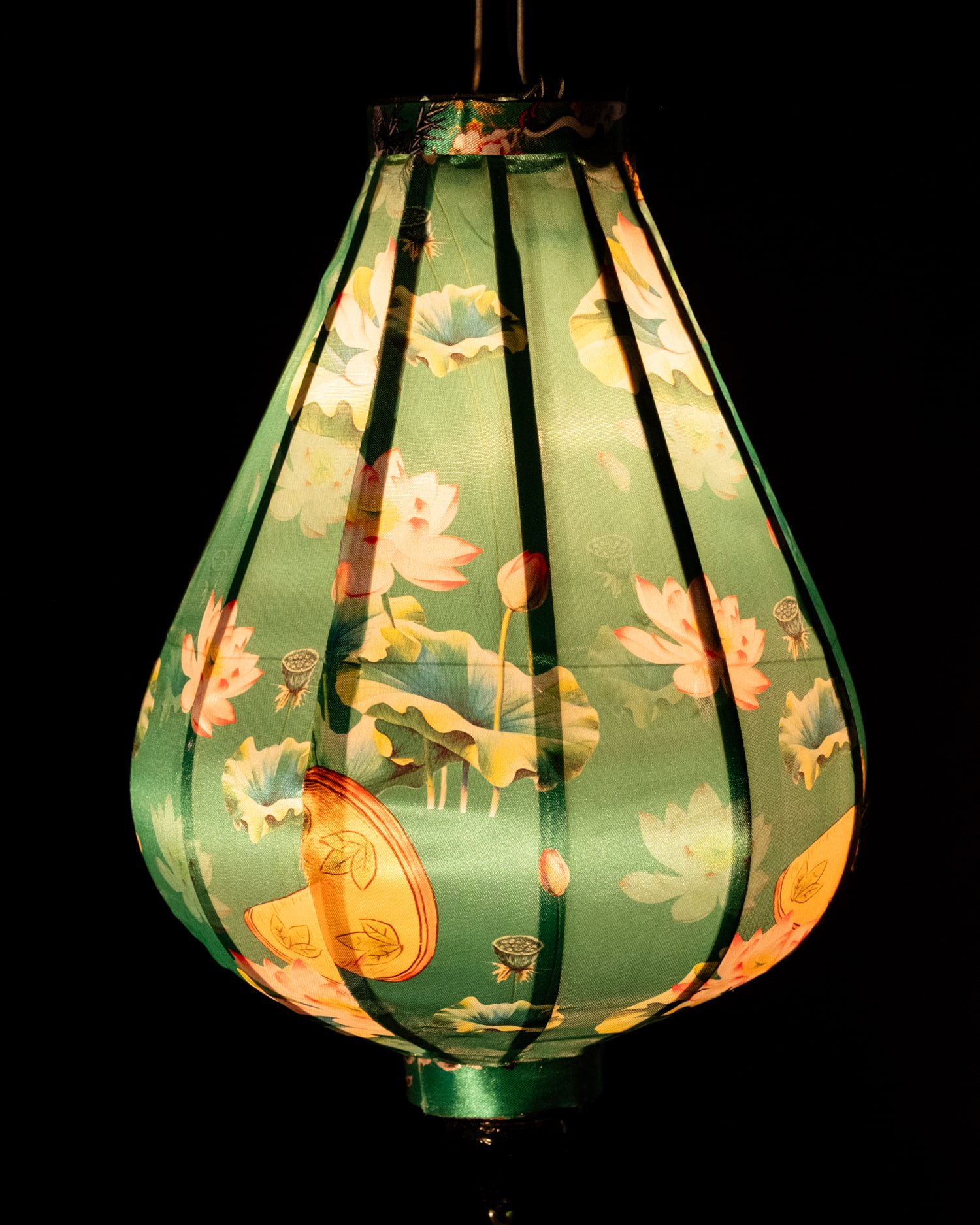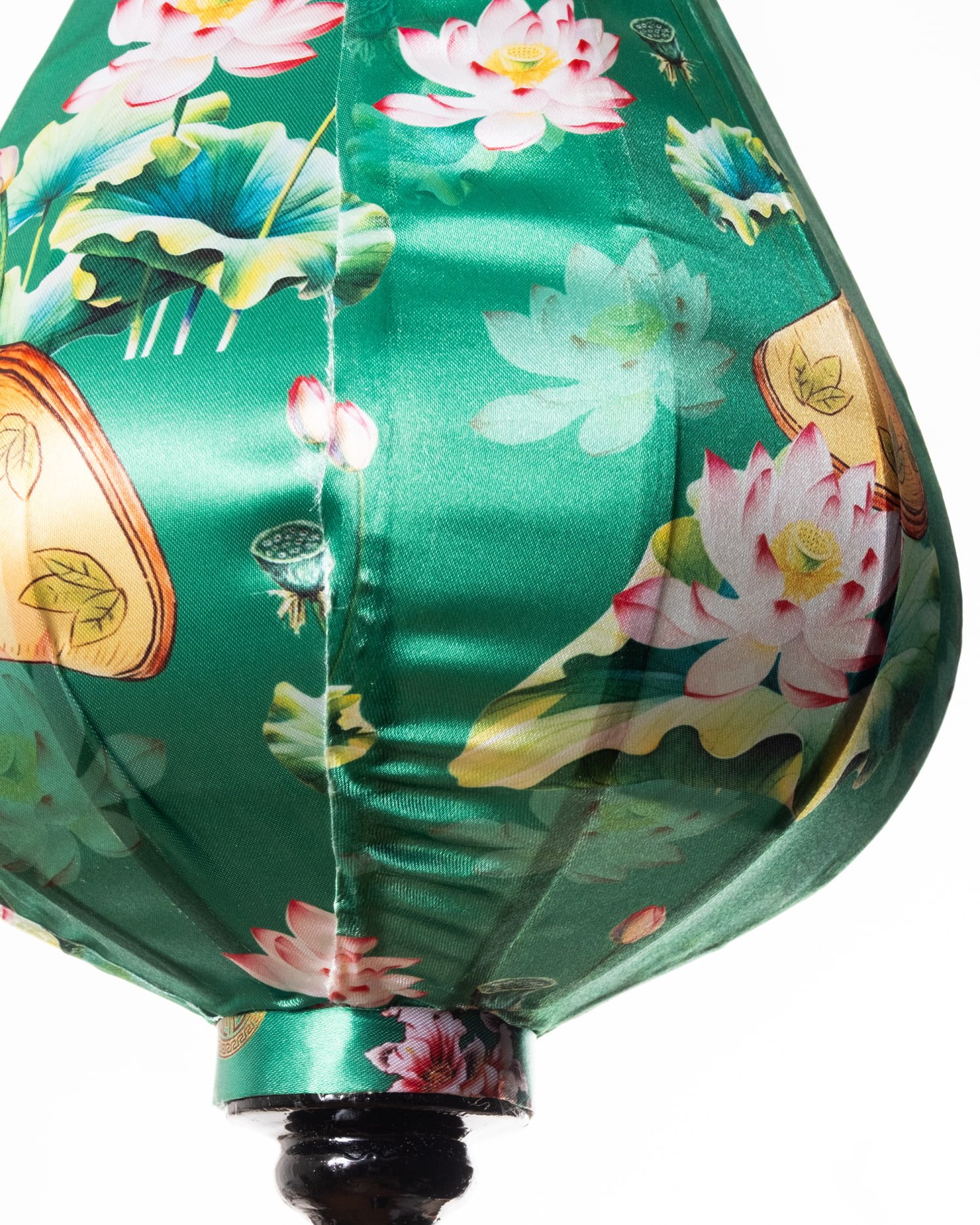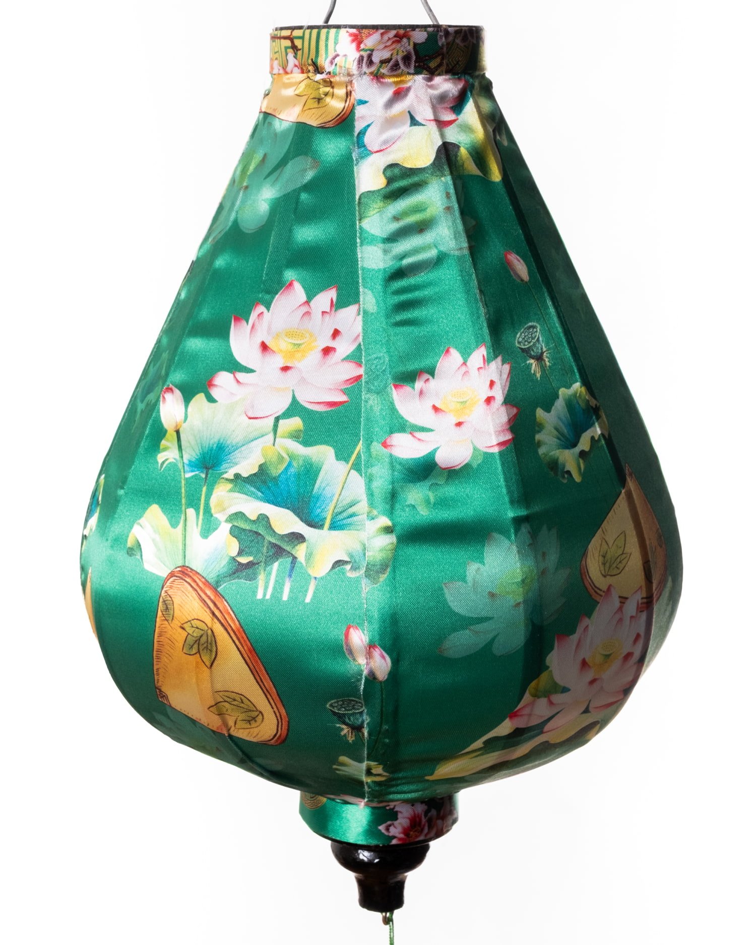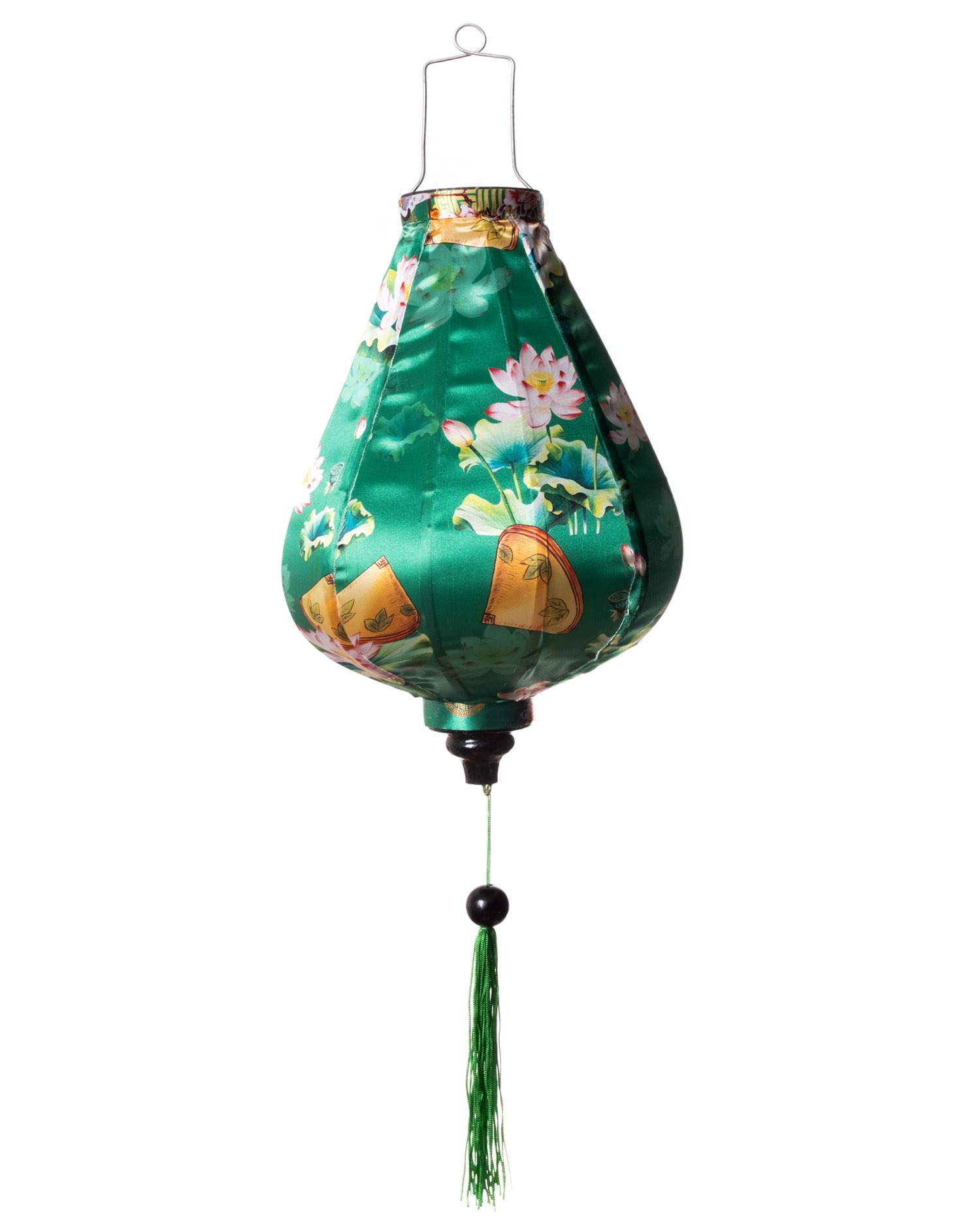 華やかな柄入り ベトナム伝統のホイアン・ランタン〔提灯〕 - ほおずき型〔ロータス模様緑〕 通販店