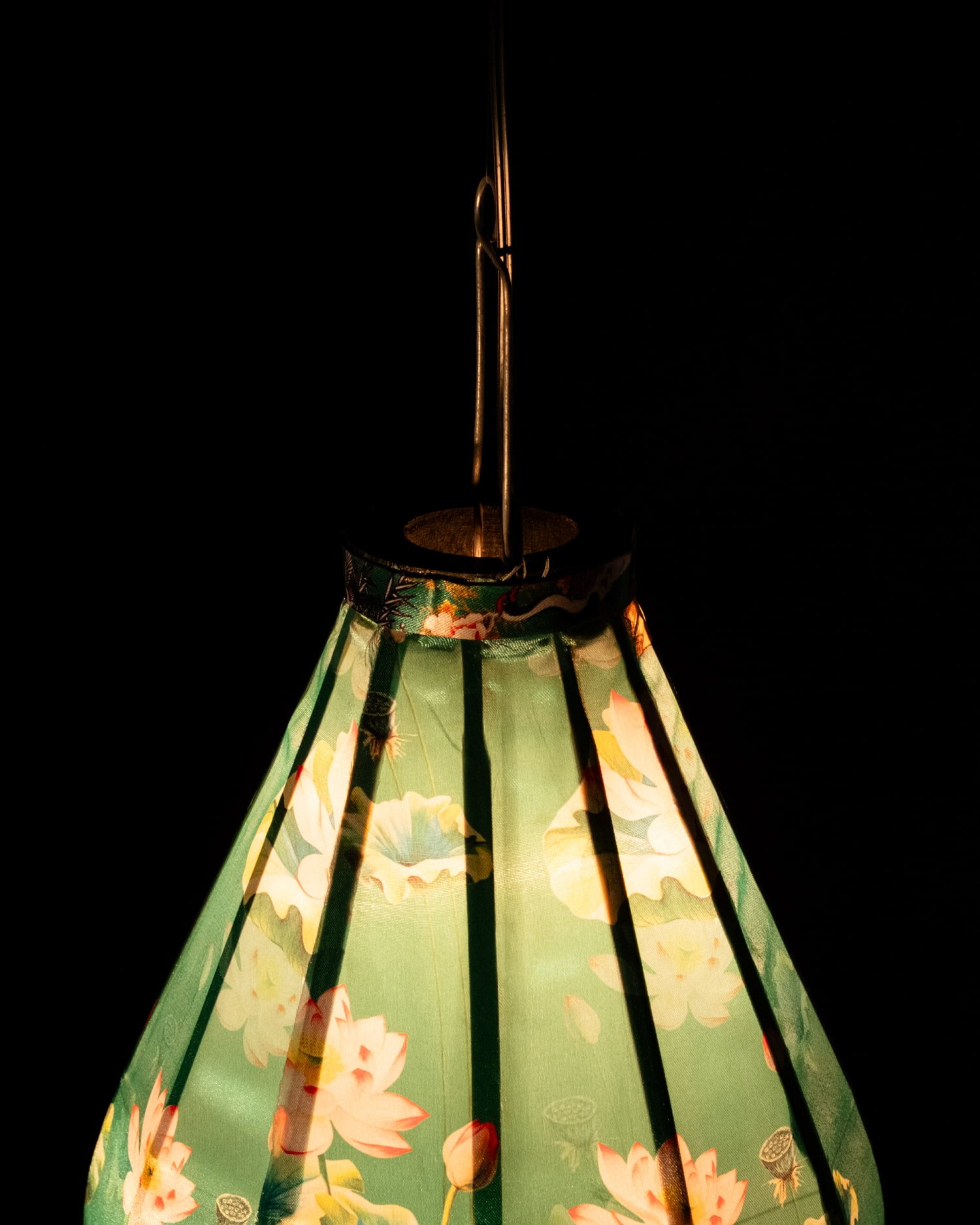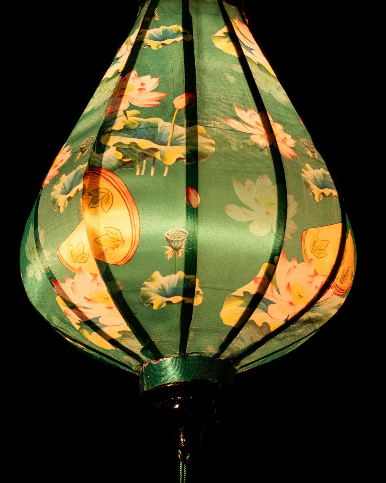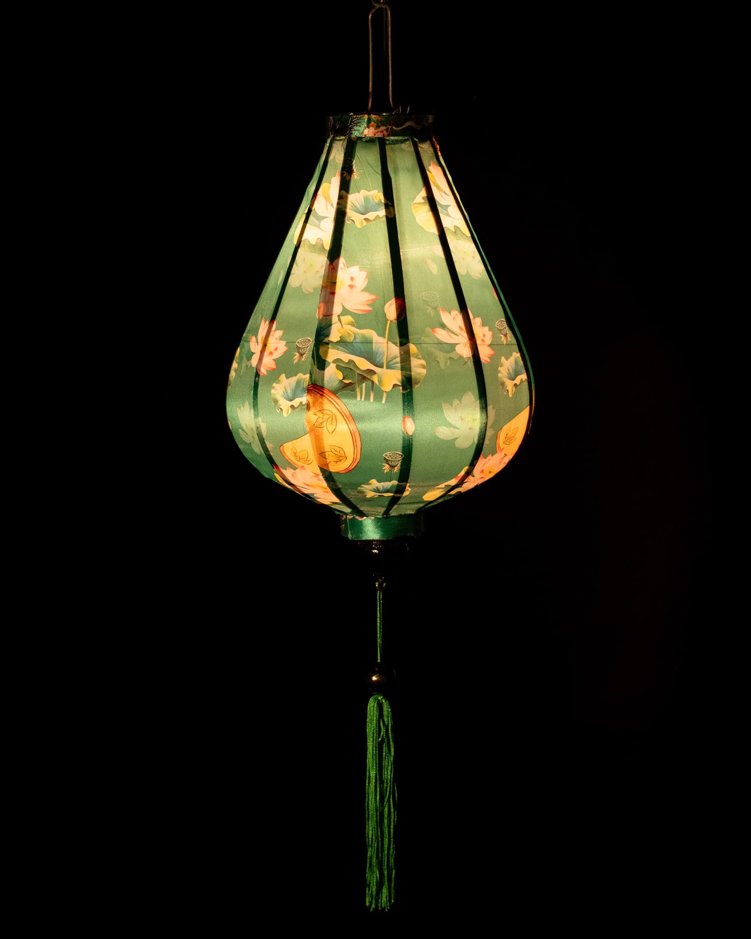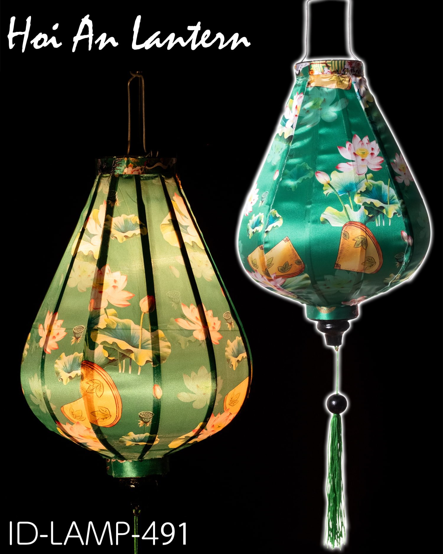 華やかな柄入り ベトナム伝統のホイアン・ランタン〔提灯〕 - ほおずき型〔ロータス模様緑〕 通販店
