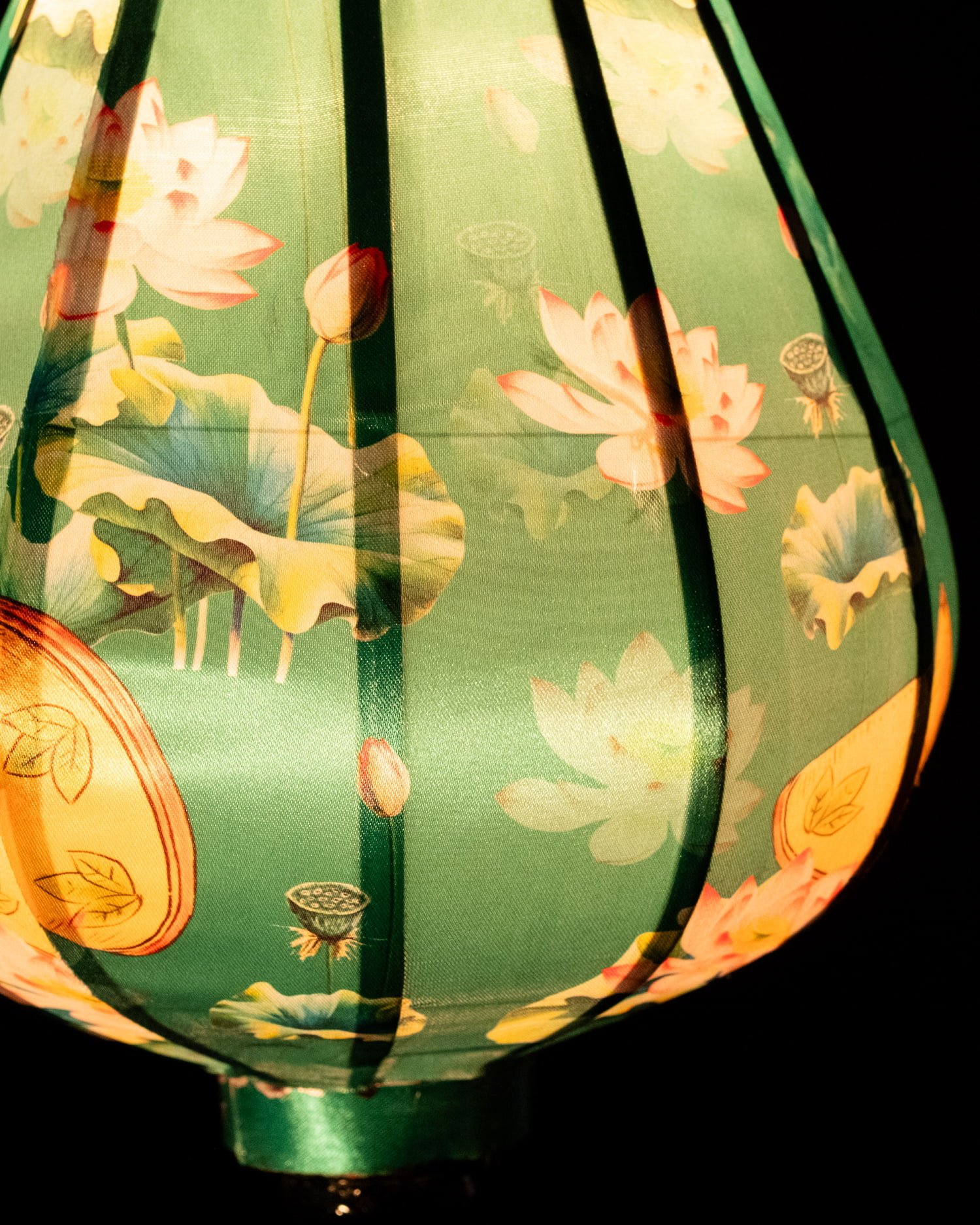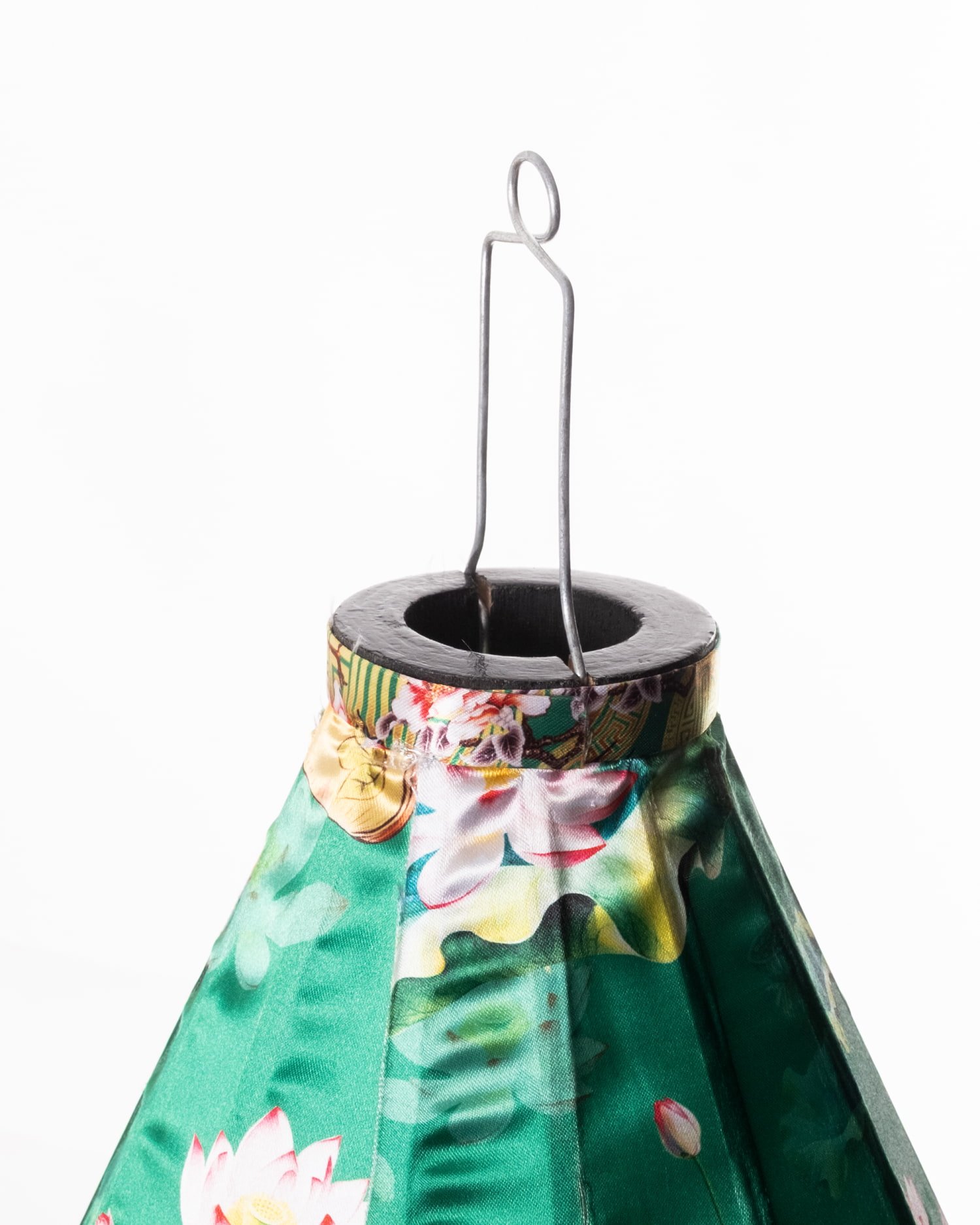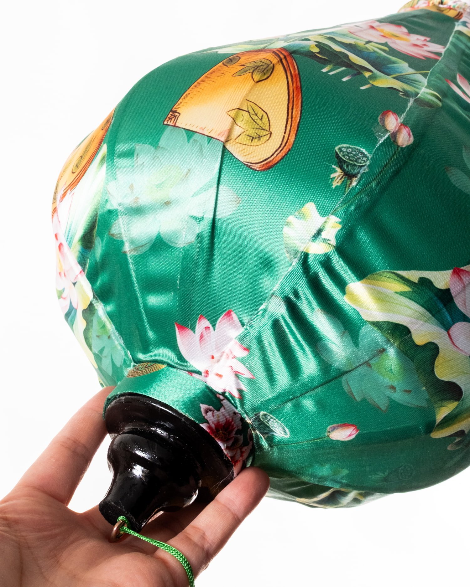 華やかな柄入り ベトナム伝統のホイアン・ランタン〔提灯〕 - ほおずき型〔ロータス模様緑〕