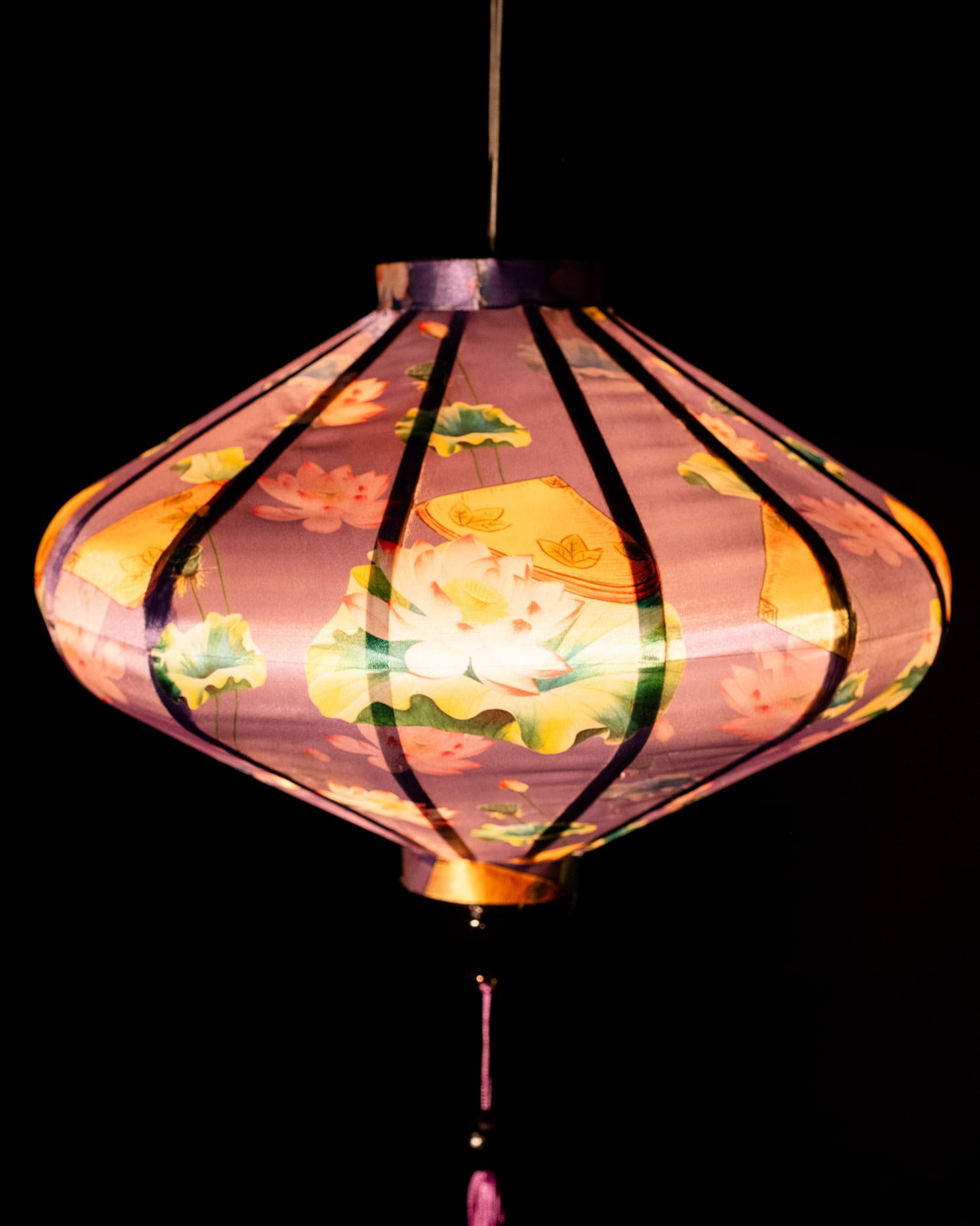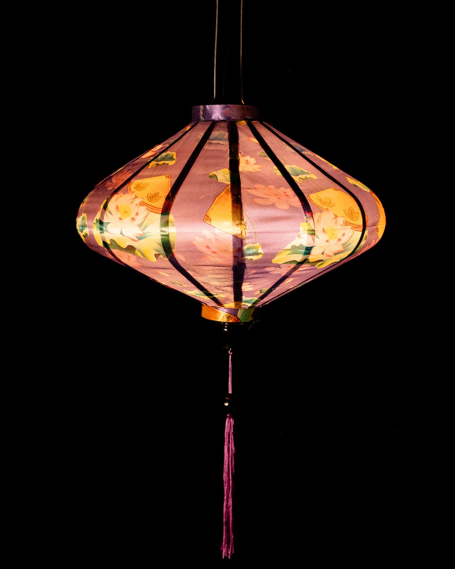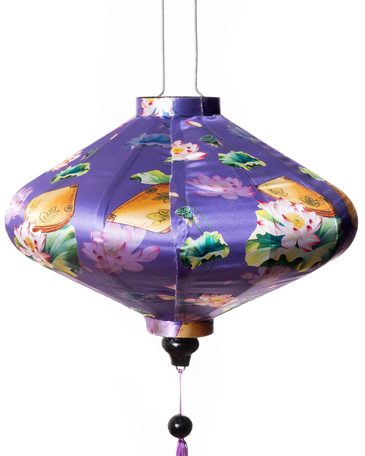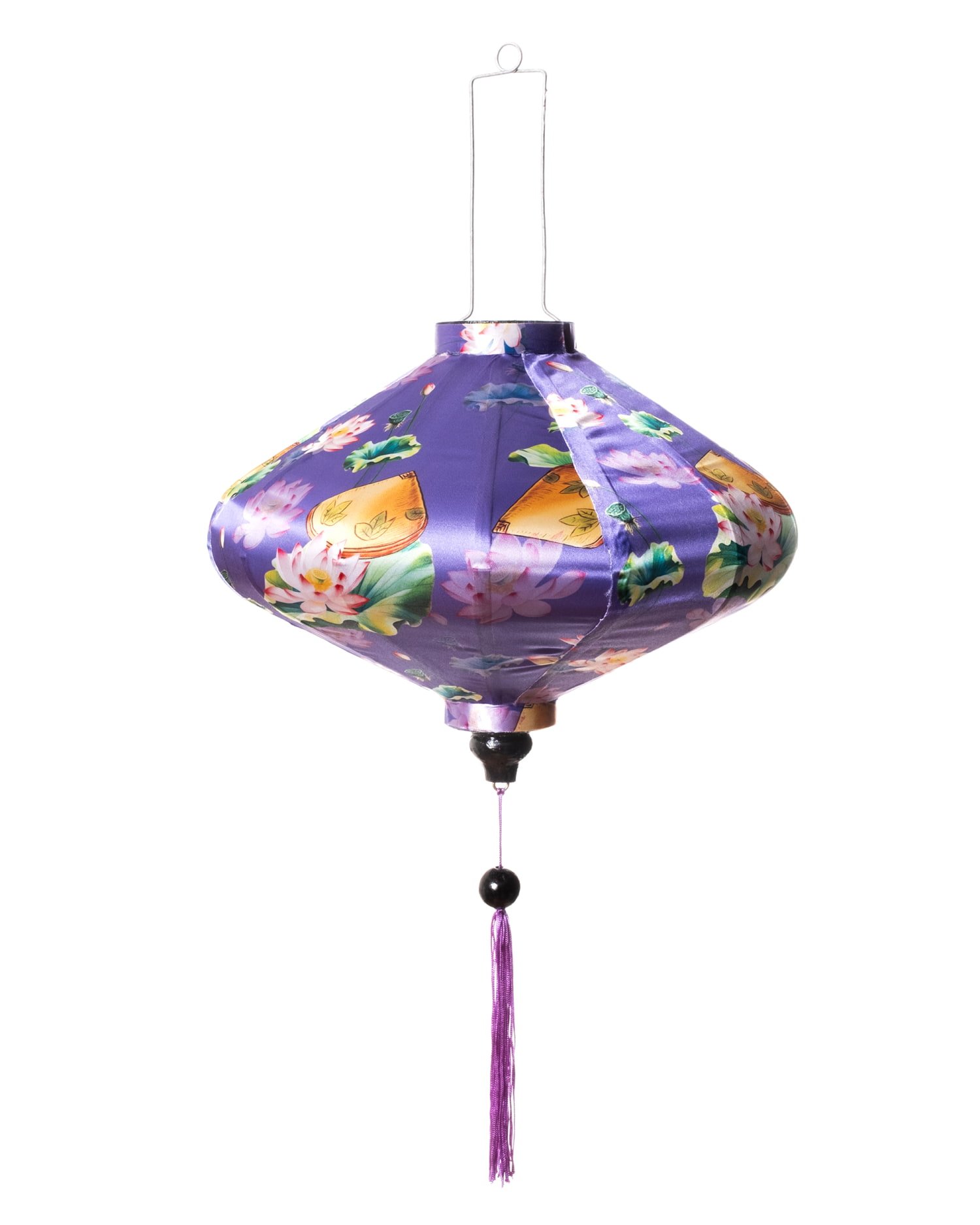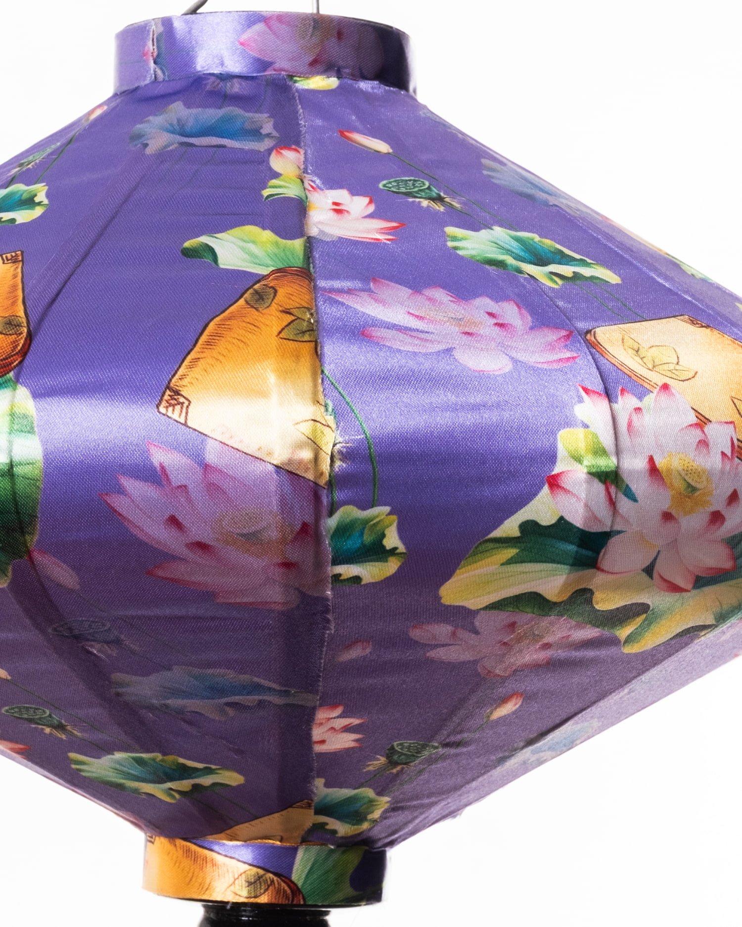 華やかな柄入り ベトナム伝統のホイアン・ランタン(提灯) - 薄ひし形〔睡蓮とノンラー模様紫〕 通販店
