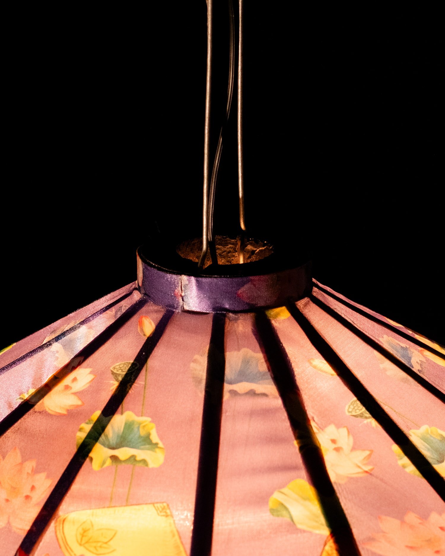 華やかな柄入り ベトナム伝統のホイアン・ランタン(提灯) - 薄ひし形〔睡蓮とノンラー模様紫〕
