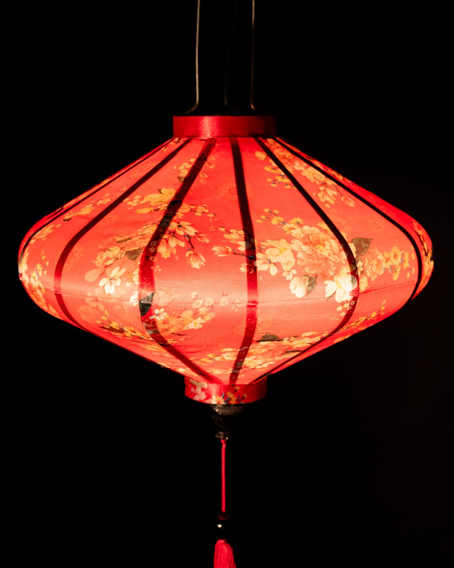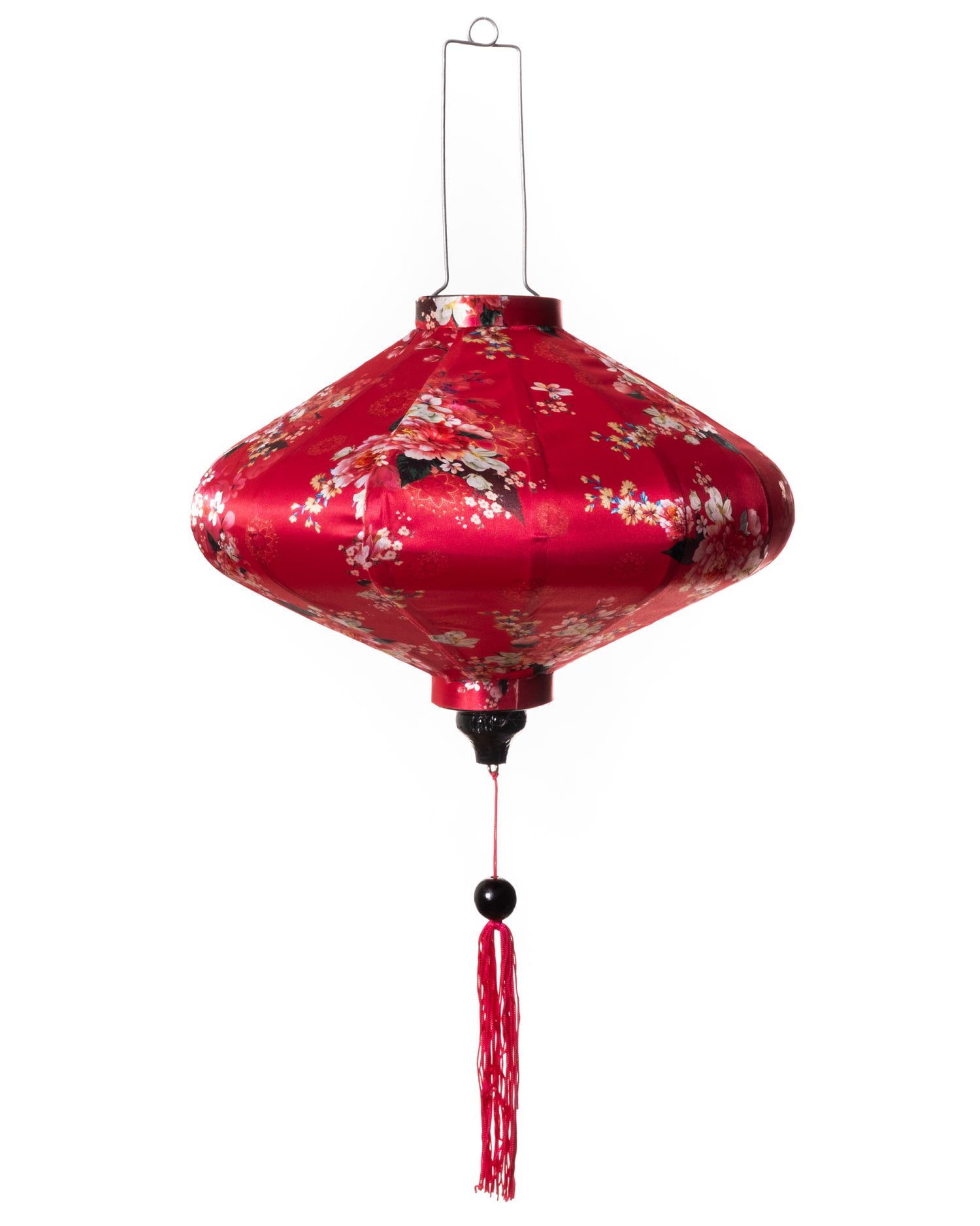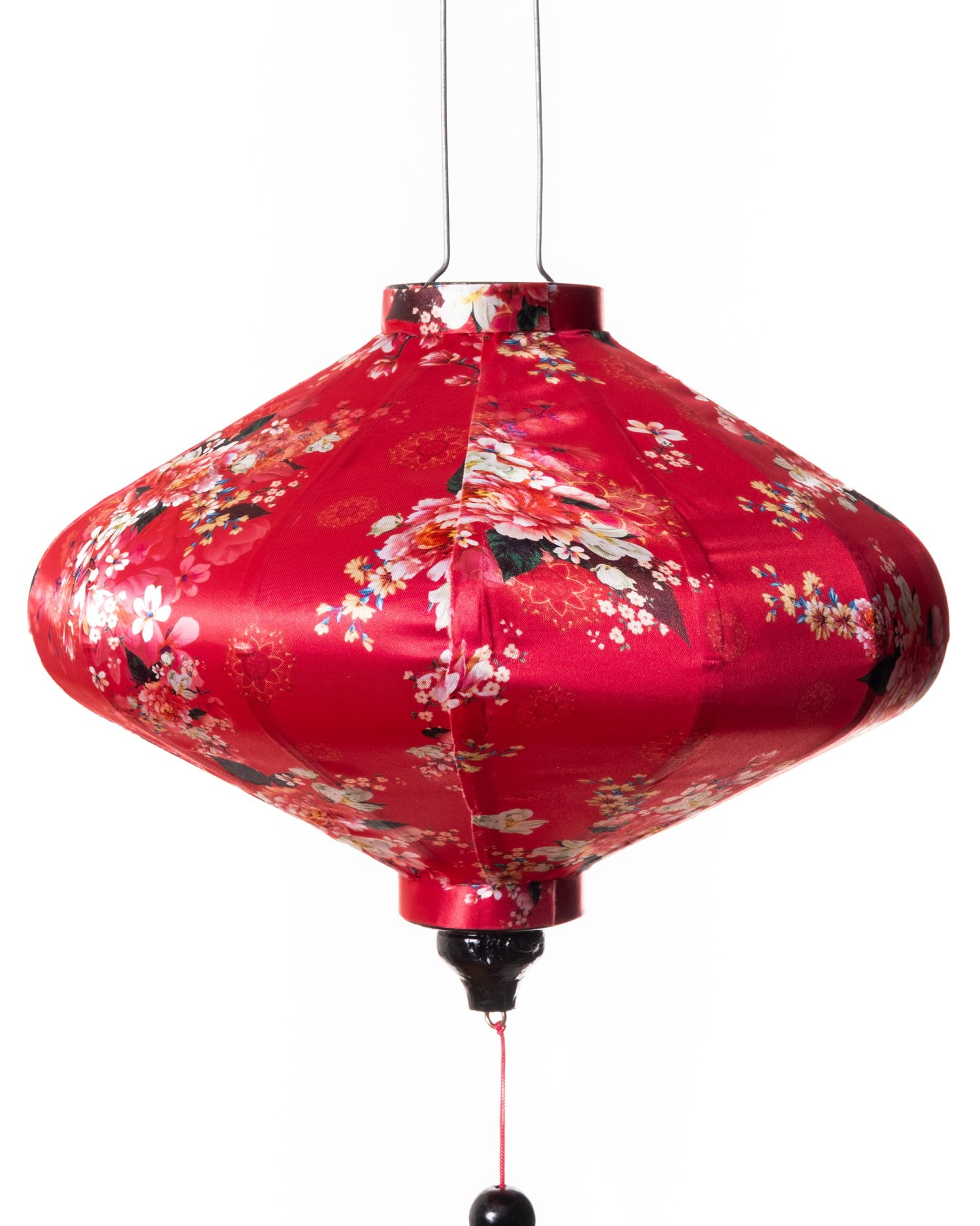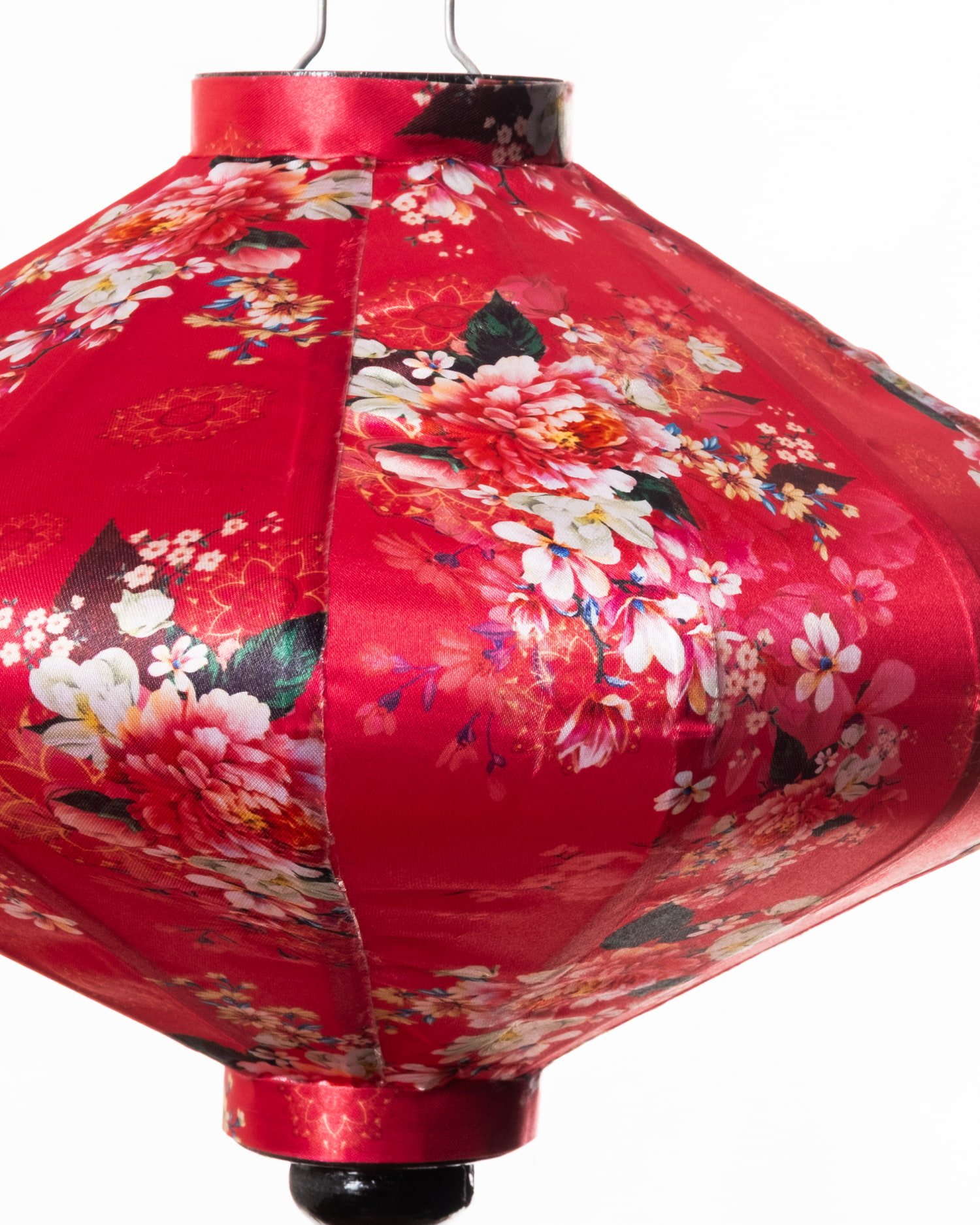 華やかな柄入り ベトナム伝統のホイアン・ランタン(提灯) - 薄ひし形〔牡丹と小花模様赤〕 通販店