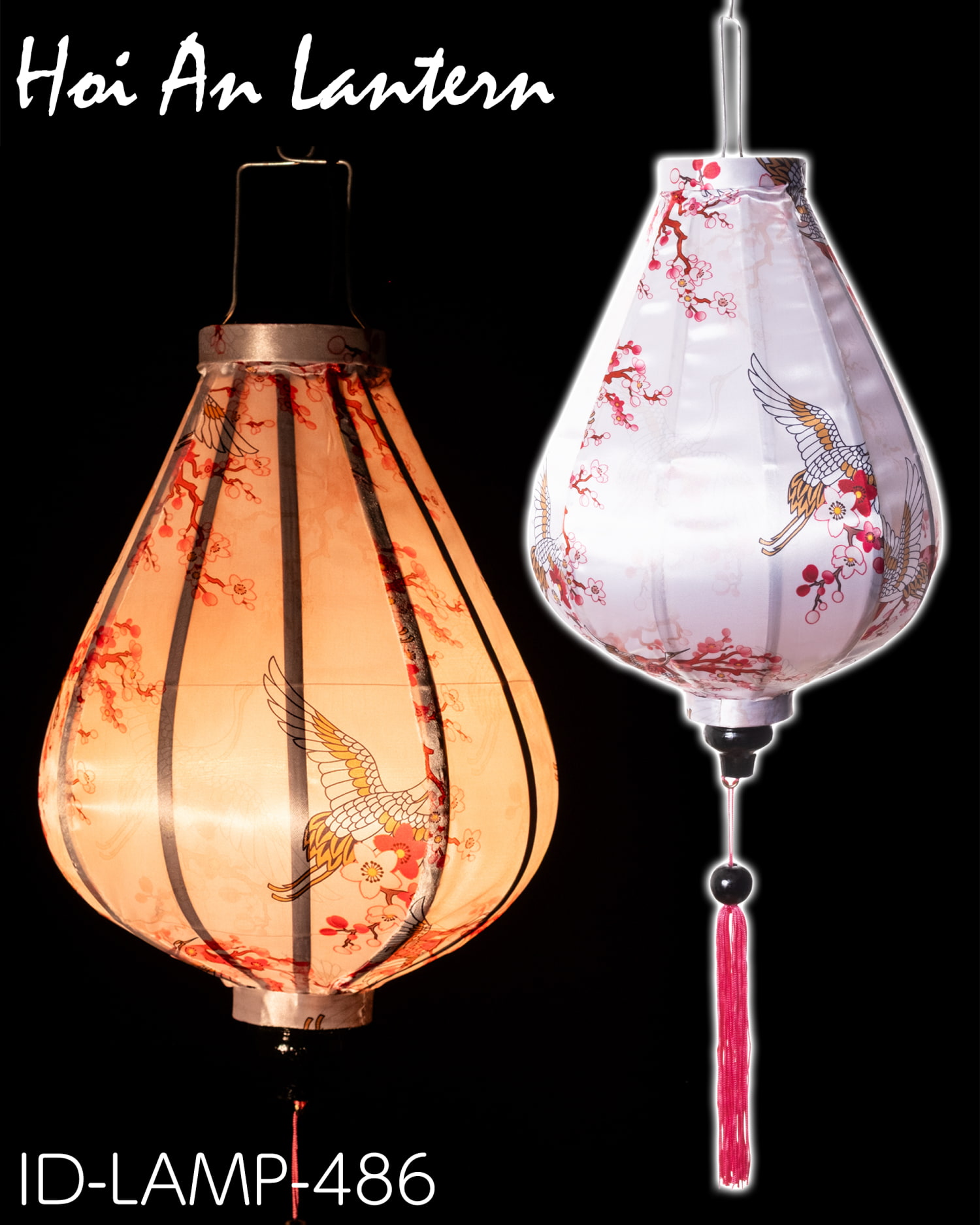 華やかな柄入り ベトナム伝統のホイアン・ランタン〔提灯〕 - ティアドロップ〔鶴と梅の花模様〕(ID-LAMP-486)の写真です