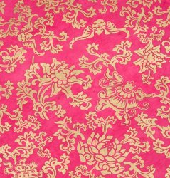 少しピンクがかった赤地に、輝く金色の柄がびっしりと入っています。