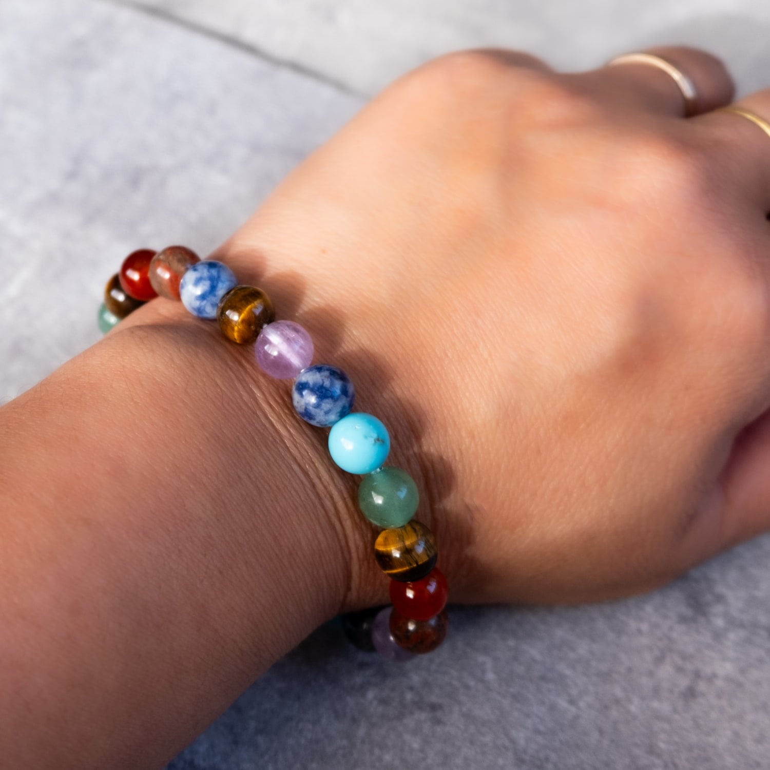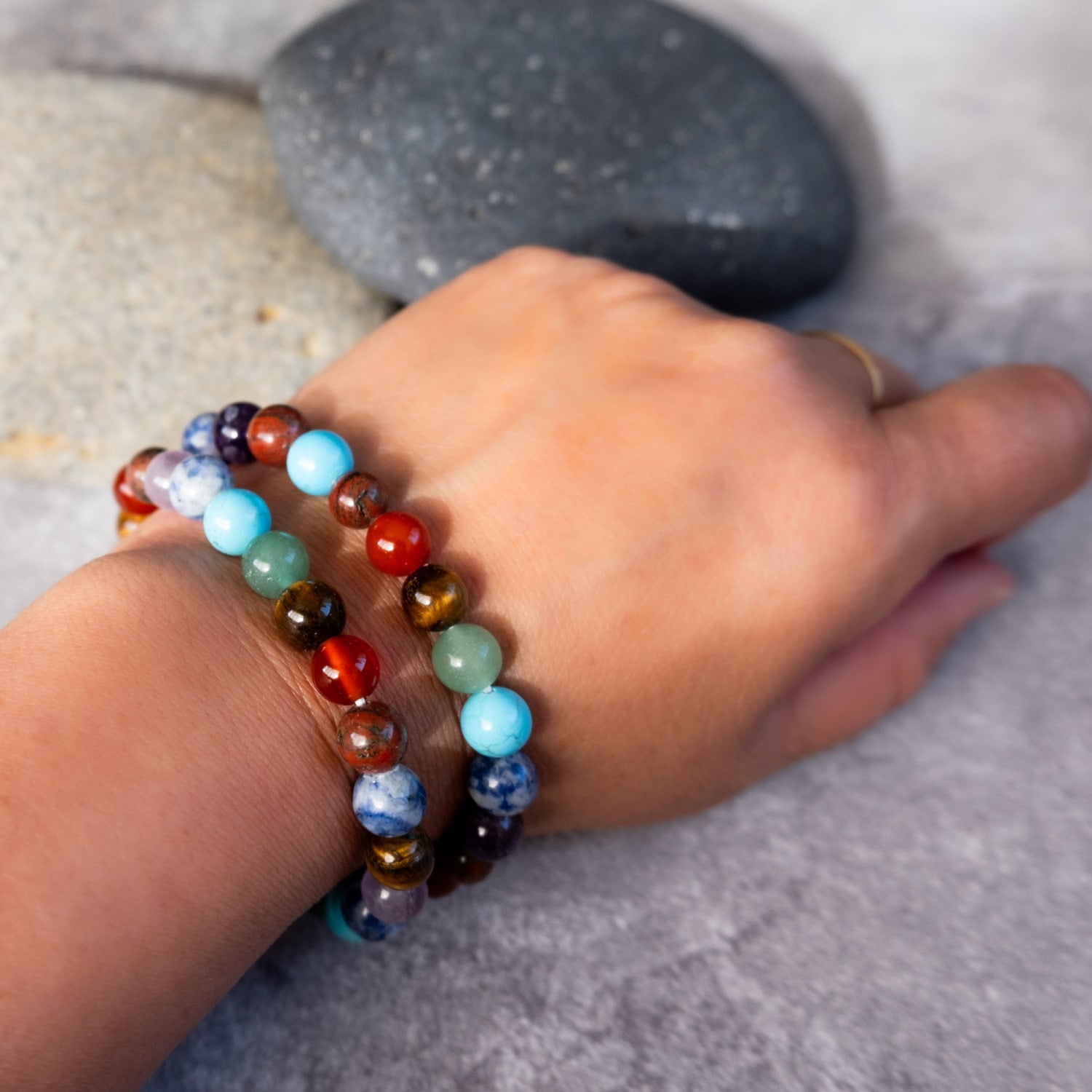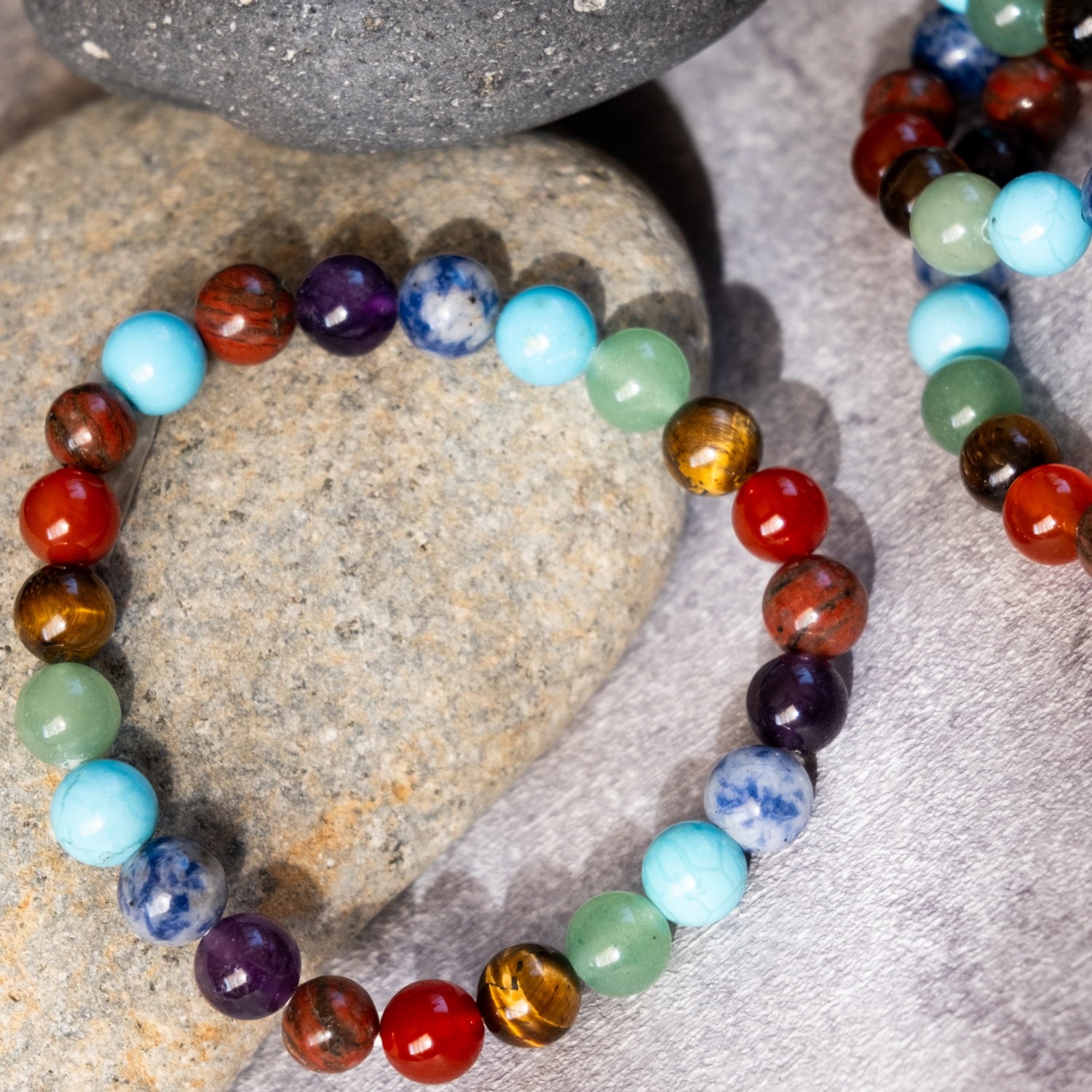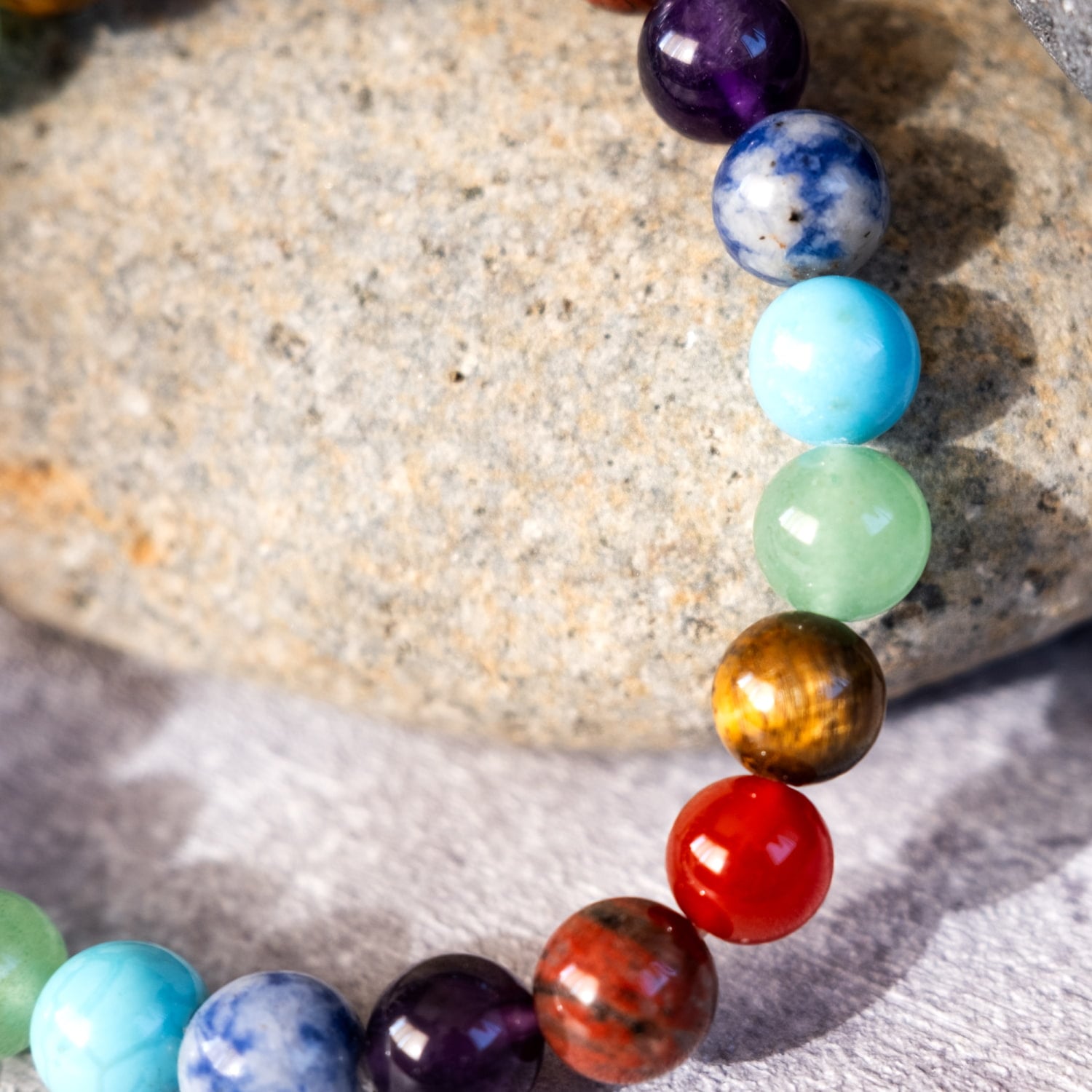 チャクラとはサンスクリット語で「光の輪」を意味し、身体で渦巻くエネルギーの中心点となります。肉体、精神、情緒、魂のバランスを維持する大切な働きをします。ひとつのチャクラのバランスが崩れると、他のチャクラに影響を及ぼし、他の箇所にも不調をきたすと言われています。チャクラカラーの天然石は着けているだけでパワーを与えてくれそうです。(ターコイズはイミテーションになります。)7つのエネルギーカラー(チャクラ)に着想を得て、日常にさりげなく取り入れやすいデザインに仕上げています。
