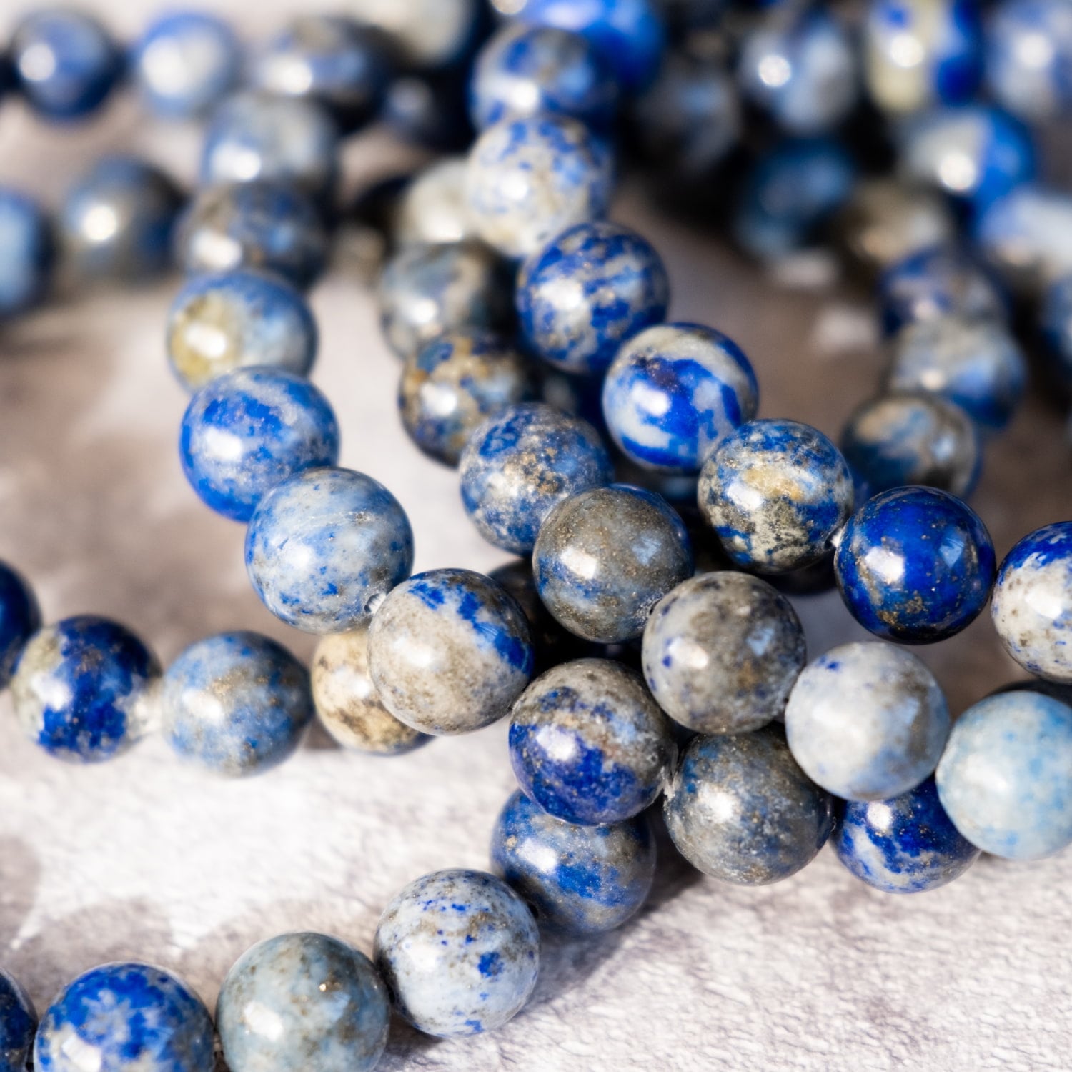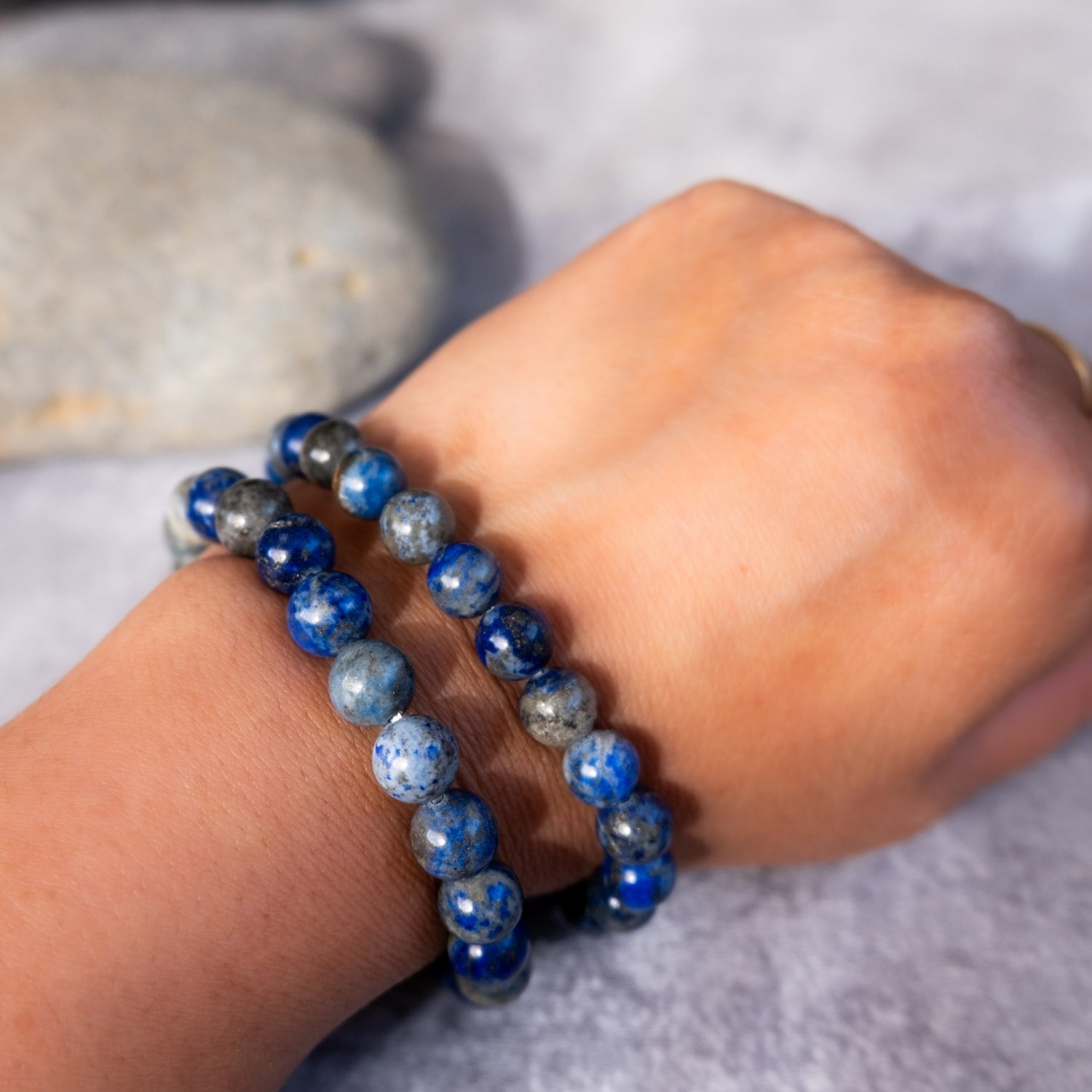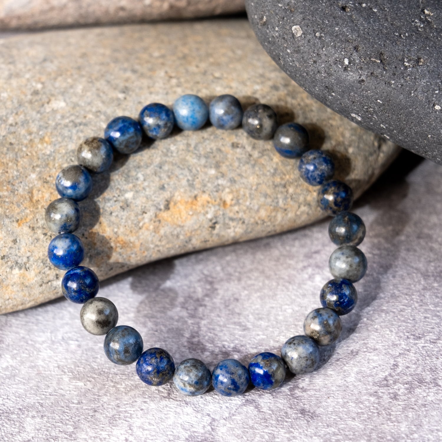 美しいカラーストーンブレスレット。青の中に浮かぶグレーやゴールドのような模様は、神秘的な表情を演出し、 ひとつひとつ異なる色合いが、天然石ならではの魅力を引き立てます。