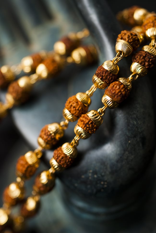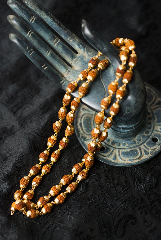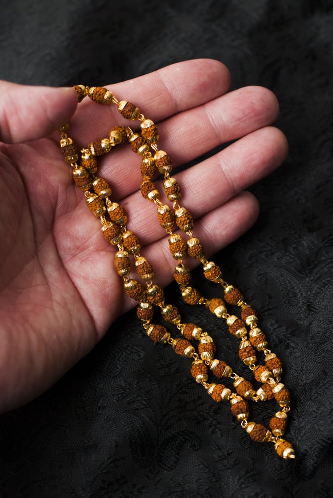 神々の住まう国インドからやってきた数珠。この数珠は、ヒンドゥー教の巡礼者がガンジス側のほとりで巡礼する時等に使われる聖なるもので、多くのインド人が巡礼の福を廻りに分ける意味合いで購入し、旅の証として持って帰る事でも知られています。仏教の発祥地インドの数珠。日本のきれいな数珠に比べると、素朴で簡素な作りですが、それが逆にいかにもインドの数珠、と言う感じを与えてくれますね。祈りの場面ではもちろん、普段の装いのグレードアップにも素敵なアイテムです。