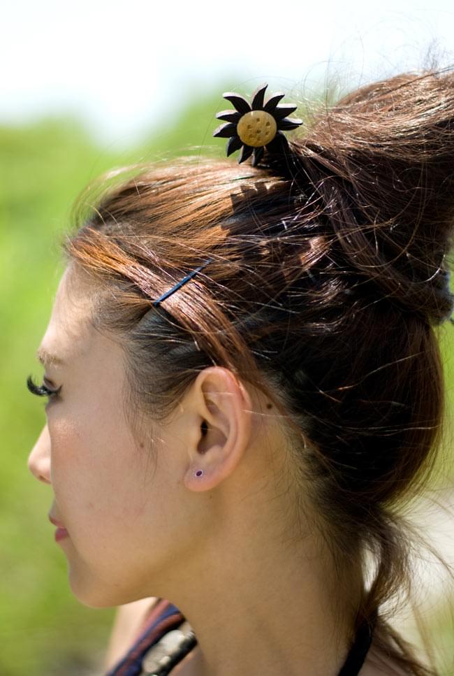届いた時にびっくりするほど先が尖っていたので、フライパンの裏でグリグリと削って丸くさせました。画像は削った後です。花びらの部分も少しギザギザしていますが、特に髪が引っかかる事は無かったです。