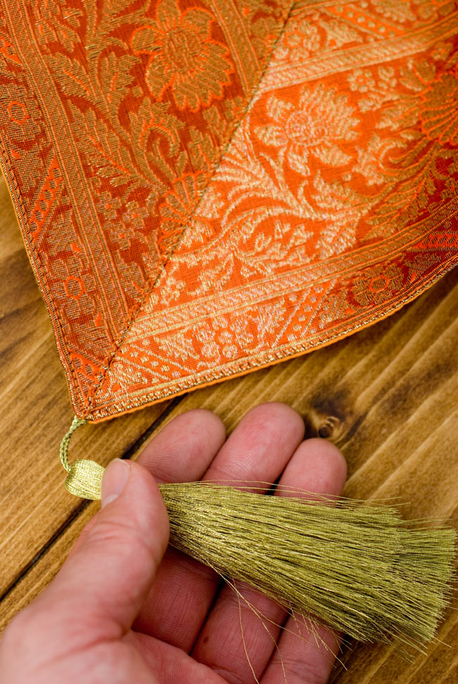 とにかく派手でカワイイ!光沢のあるサテン地に金糸の柄がよく映え、タッセルも重みがあって、これ一枚で一気にお洒落な雰囲気に。シンプルなお部屋のアクセントや、コテコテのエスニック部屋の仕上げ、SNS映えするホームパーティーの演出にもオススメです。袋から出した時に染料の匂いがしますが、それもインドらしいかなと思います。