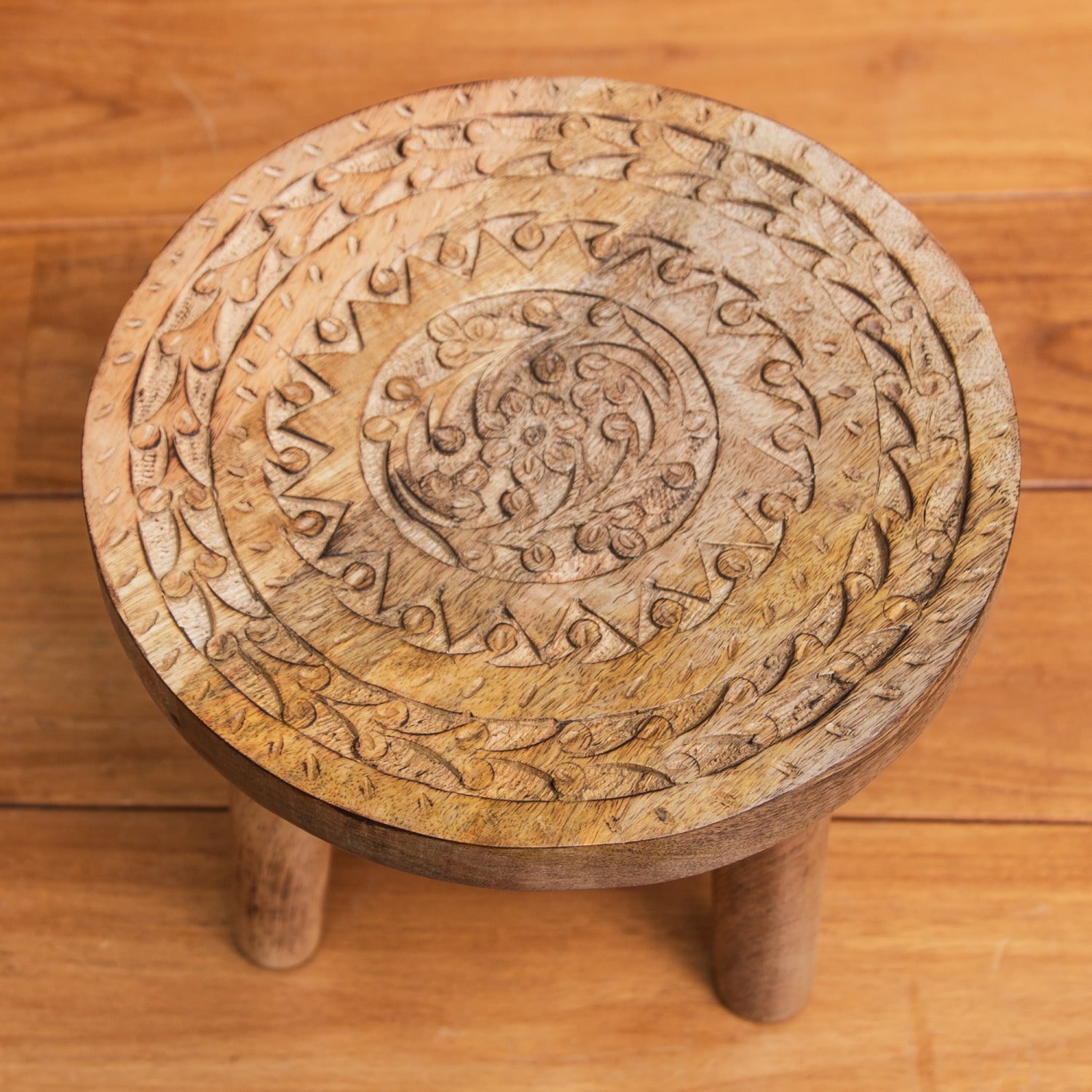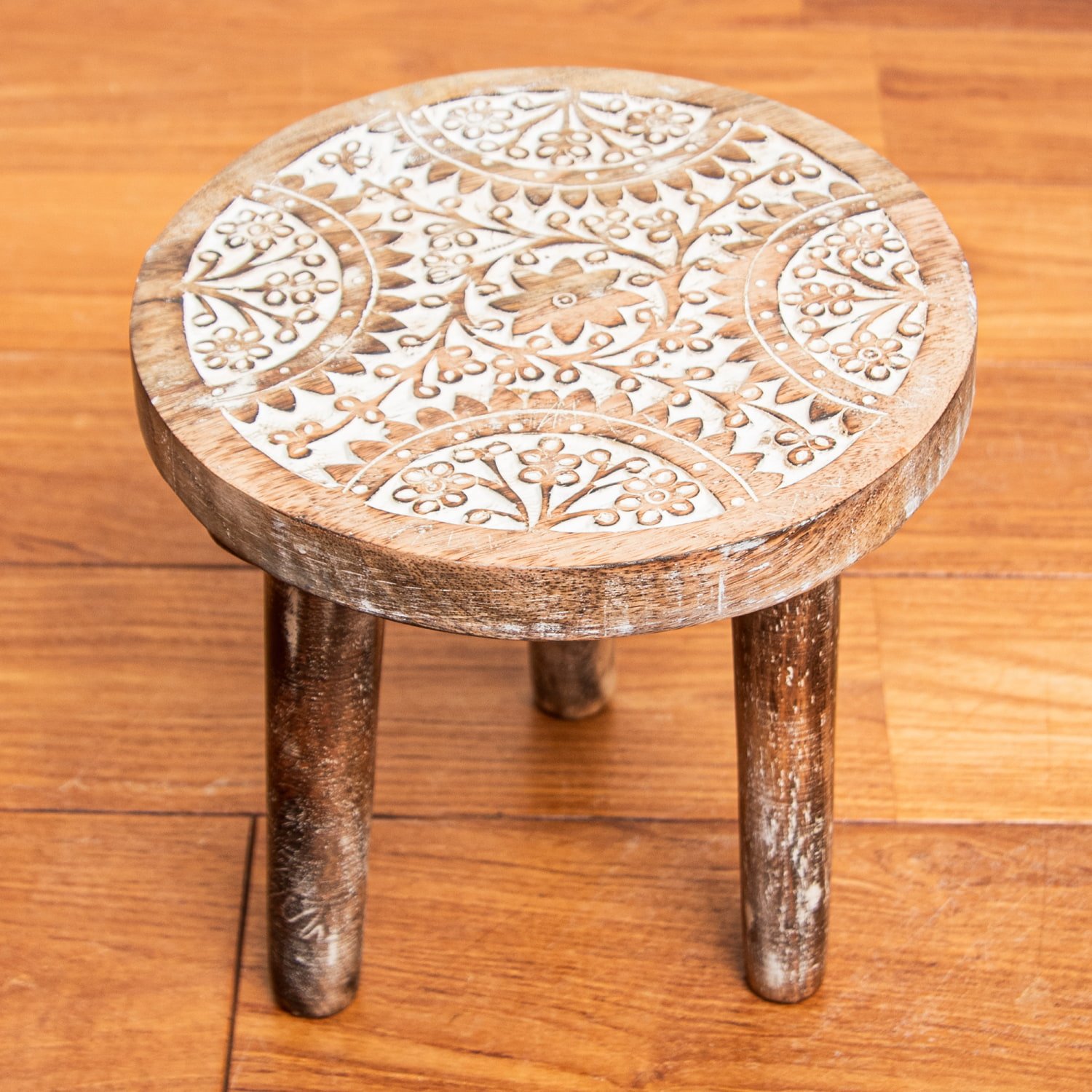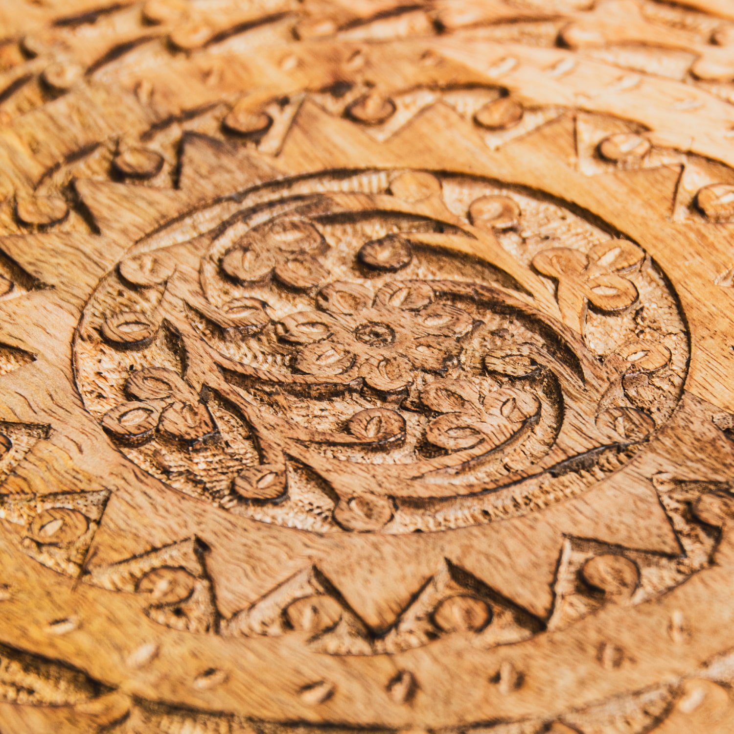 天板には、インドの職人が一つひとつ手彫りで仕上げたマンダラ模様。 繊細な線と花模様が浮かび上がり、美しい陰影を作り出します。小さいながらも存在感があり、エスニックインテリアのアクセントとして最適です。■環境にやさしいマンゴーウッド製