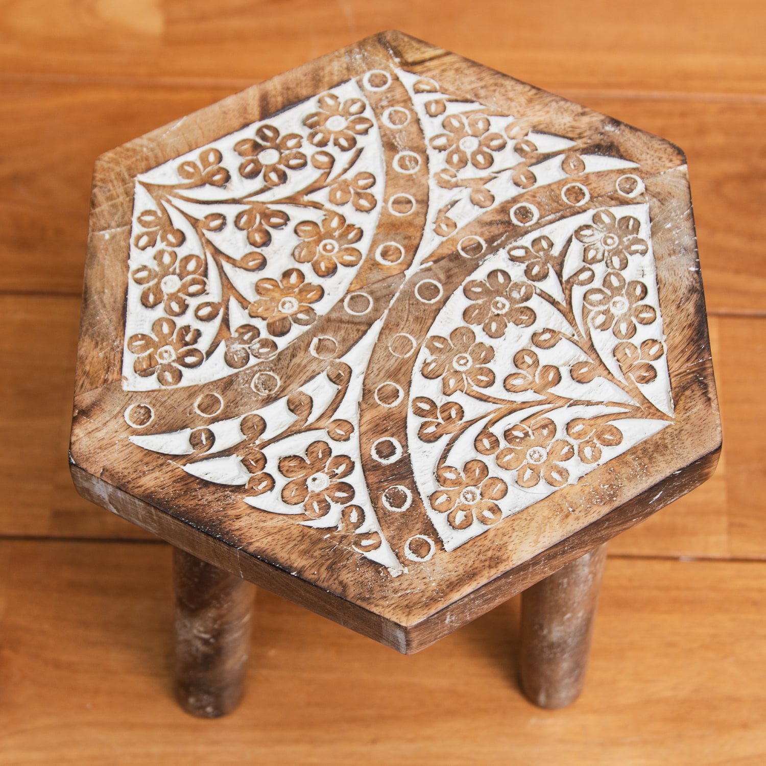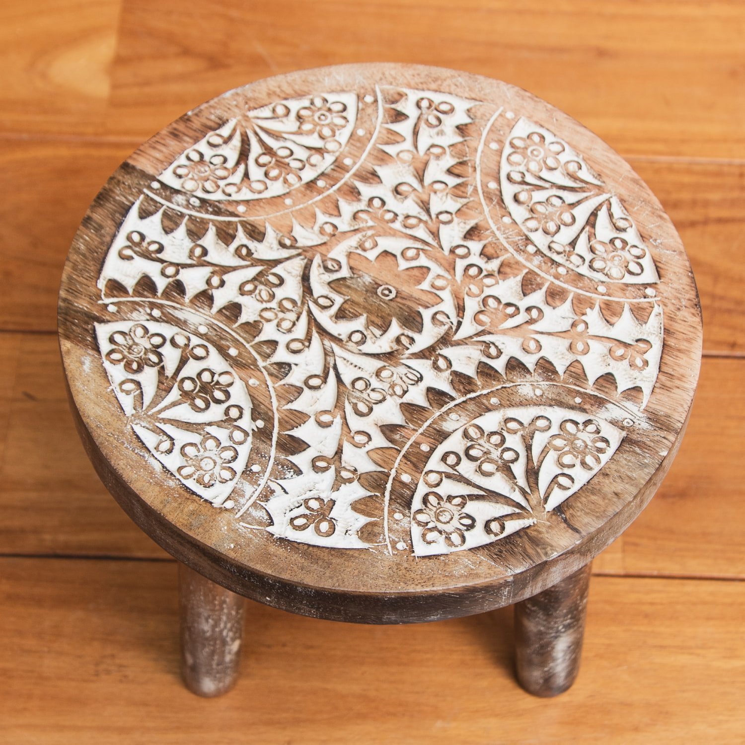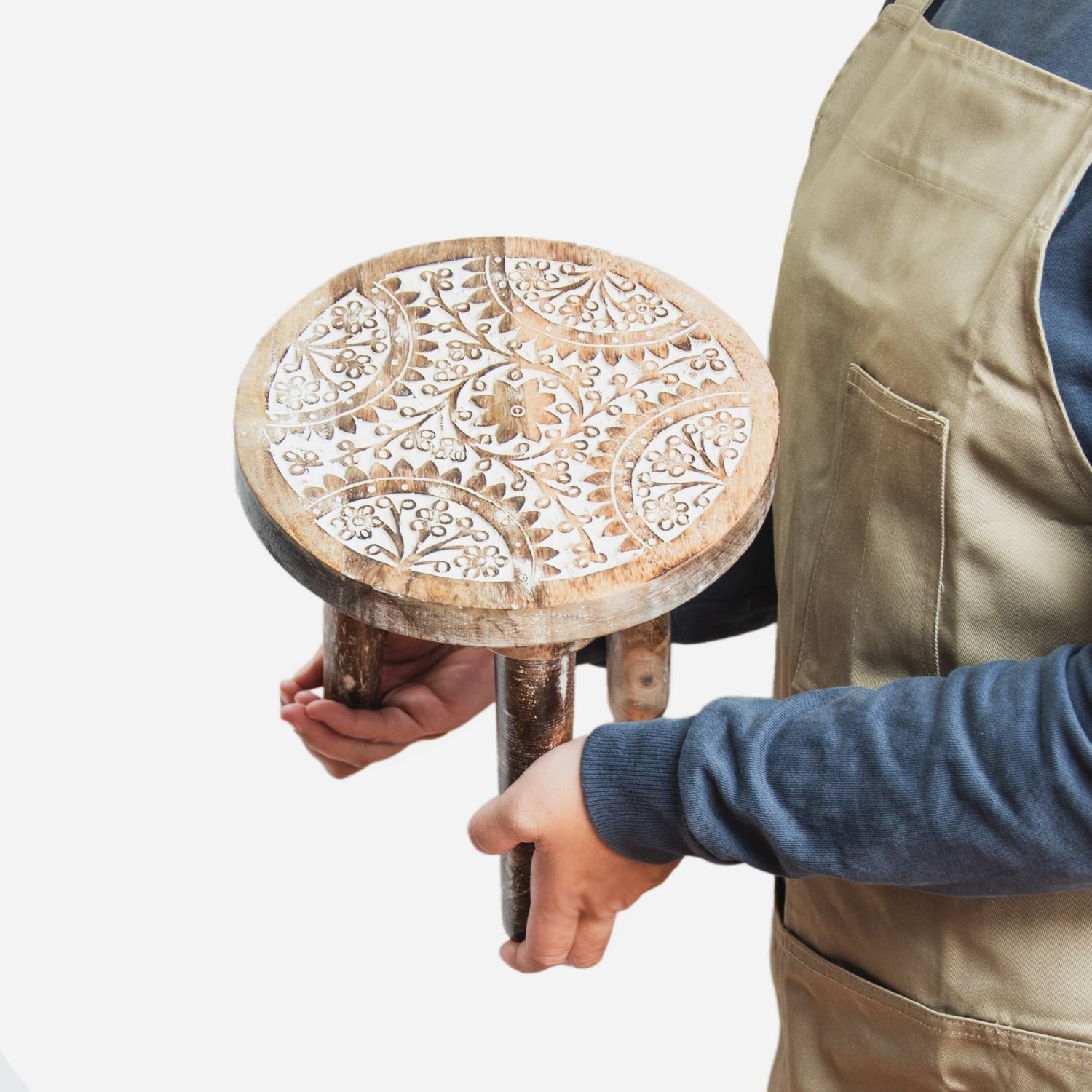 天板には、インドの職人が一つひとつ手彫りで仕上げたマンダラ模様。 繊細な線と花模様が浮かび上がり、美しい陰影を作り出します。小さいながらも存在感があり、エスニックインテリアのアクセントとして最適です。■環境にやさしいマンゴーウッド製