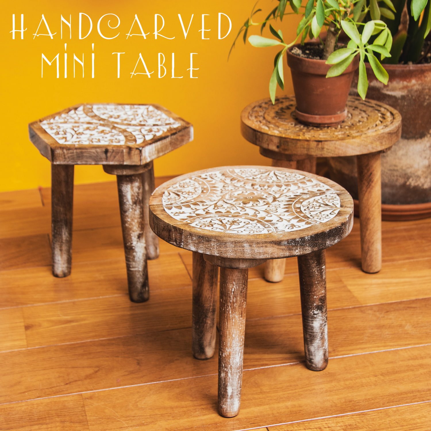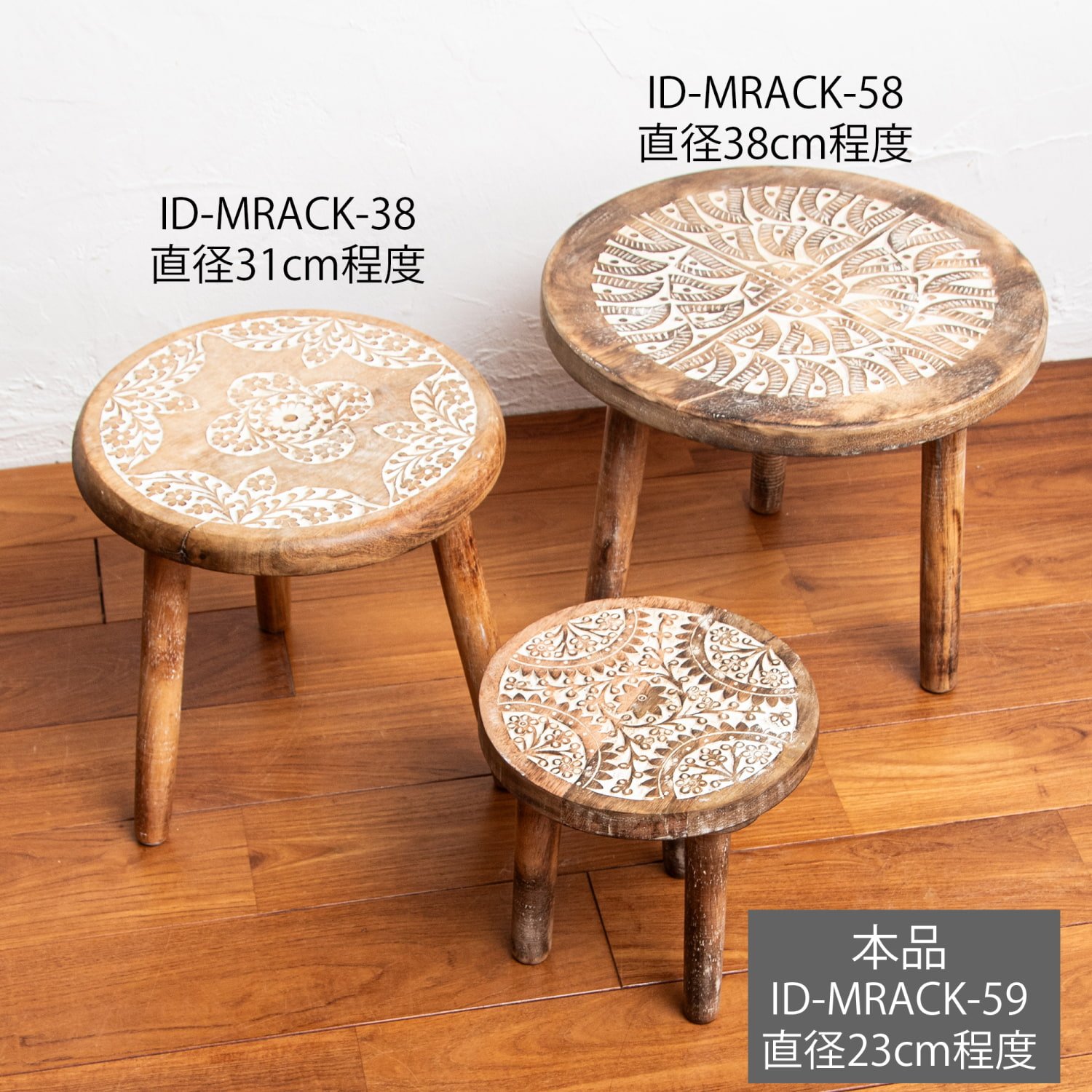 インドの工房で見つけた、思わず笑顔になるほど可愛らしいミニテーブル。 直径わずか23cmというコンパクトサイズで、抱きしめたくなるような小ささが魅力です。サイドテーブルというより「ちいさな飾り台」や「プランツスタンド」として使うのがぴったり。小物や観葉植物を置くだけで、空間にインドの温もりを添えてくれます。■繊細なマンダラ彫刻が施された天板