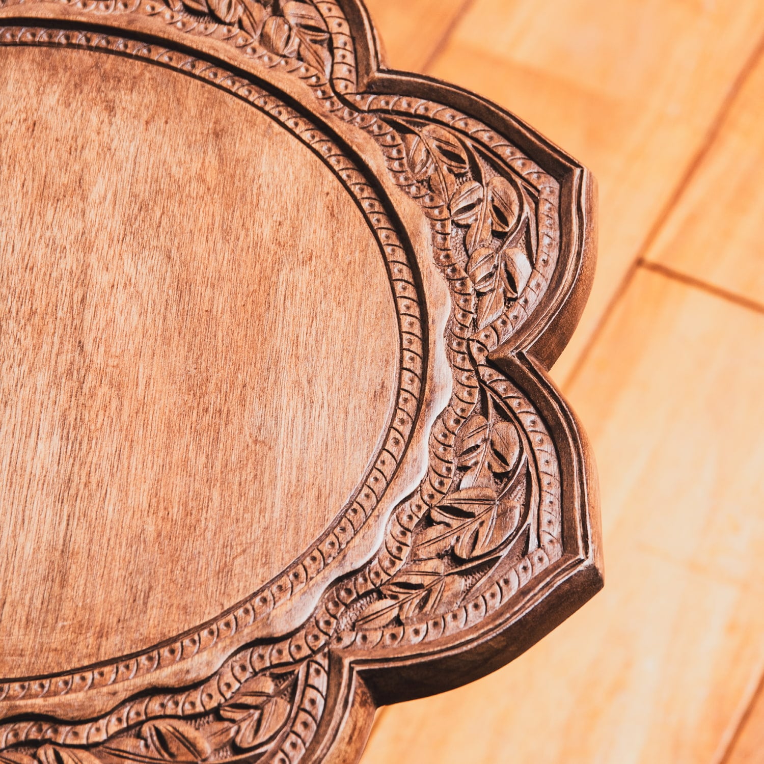 カシミールの細密彫刻 大輪花のサイドテーブル ウォールナット製 直径37cm