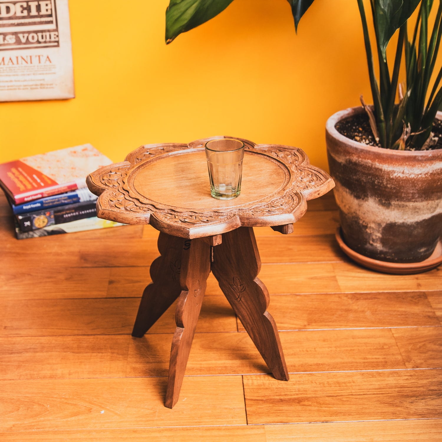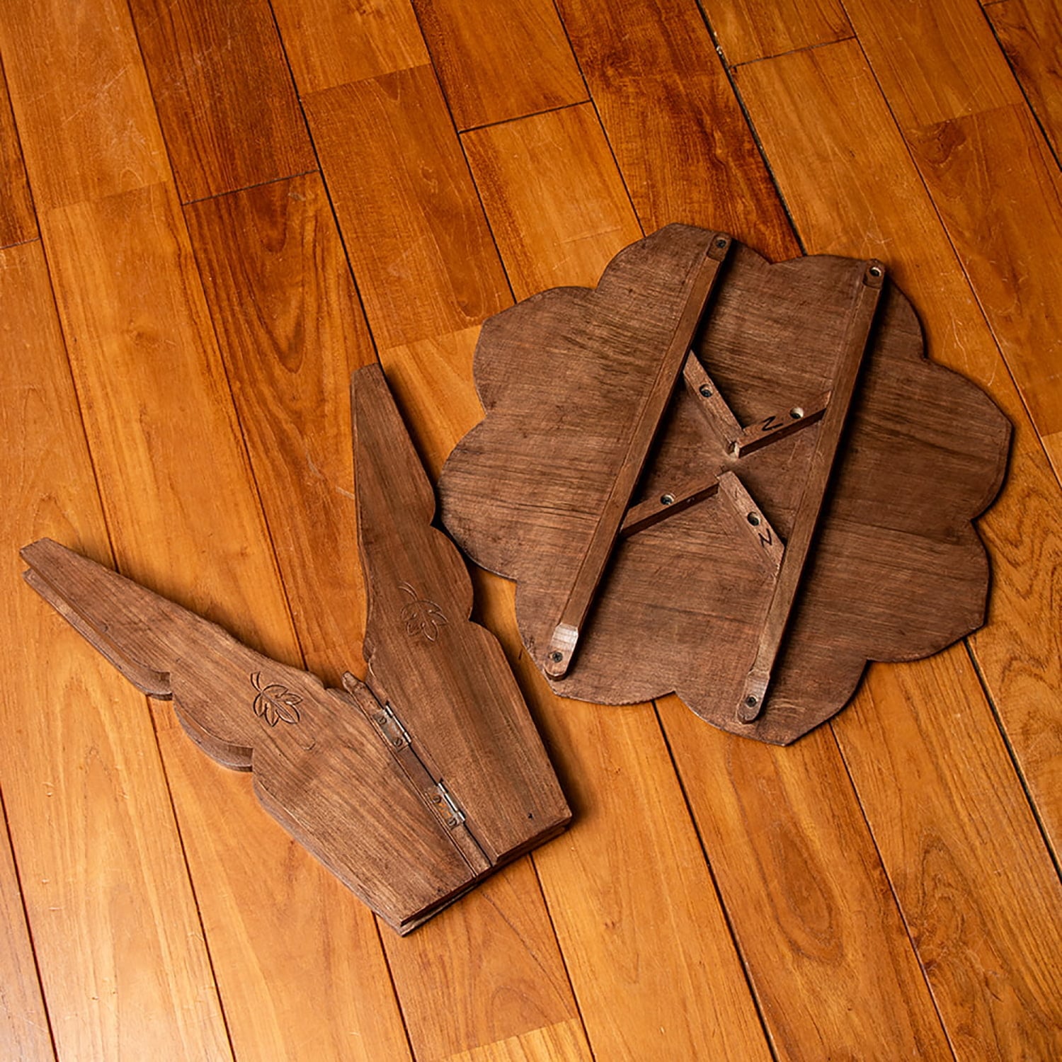 カシミールの細密彫刻 大輪花のサイドテーブル ウォールナット製 直径37cm 通販店