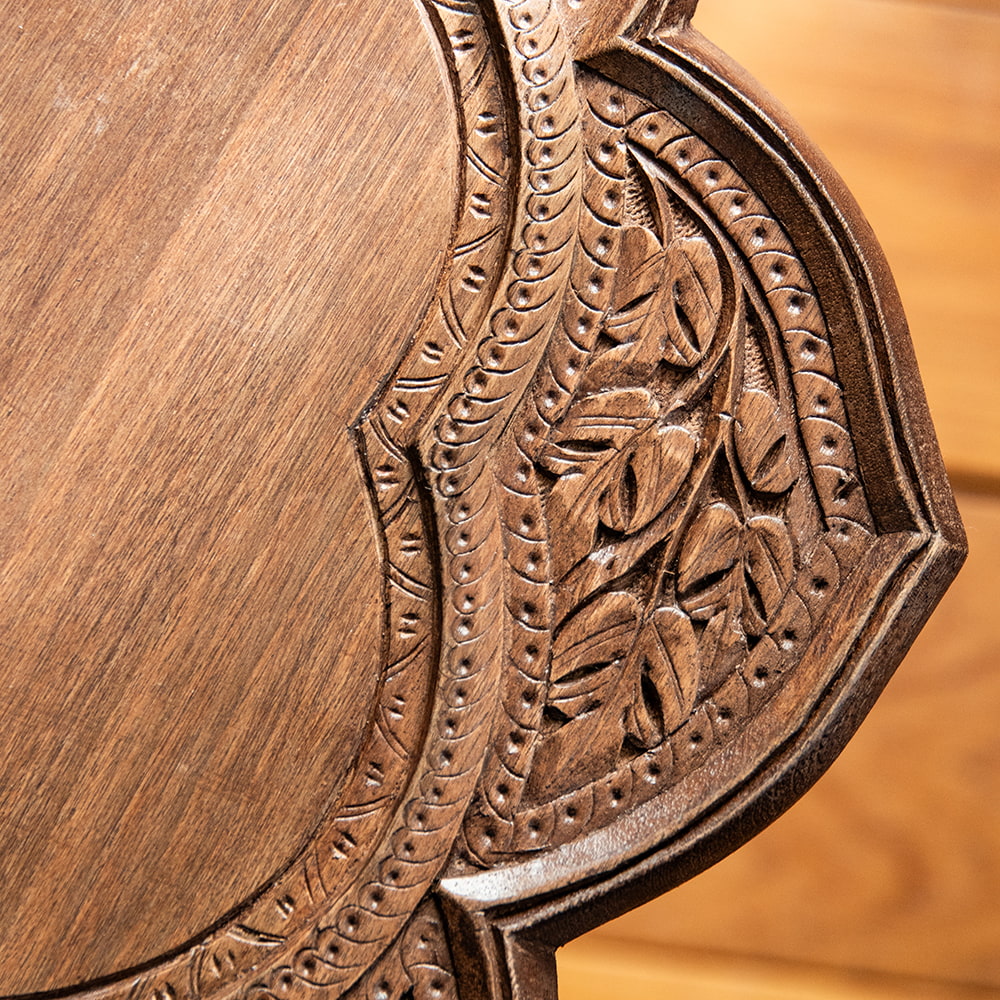 [ちょっと訳あり]カシミールの細密彫刻 大輪花のサイドテーブル ウォールナット製 直径45.5cmの商品写真 2枚目 職人技の光る、細やかな彫刻が美しいです。