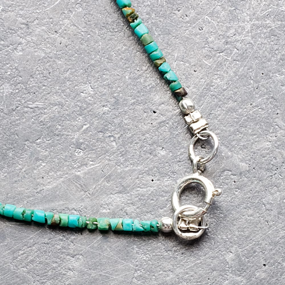 ペンダントトップのローマンガラスだけでも綺麗ですが、ペンダントチェーンの部分がローマンガラスの色合いと相性が良い、ターコイズを基調に装飾されているのが特徴です。また、緑のターコイズだけではなく、部分的にビーズや、他の天然石を混ぜてあるので、単調にならずとても綺麗な仕上がり。ストーンは首にあたっても痛くないように、しっかりと角が取られ丸くしてあります。中は細くて上部なワイヤーが入っており、ストーンを束ねてあります。細かいところまで、丁寧にハンドメイドされたネックレスです。