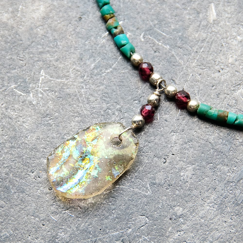 匿名希望様 〔一点もの〕ターコイズとローマングラスのペンダント付きネックレス ローマ時代からの贈り物