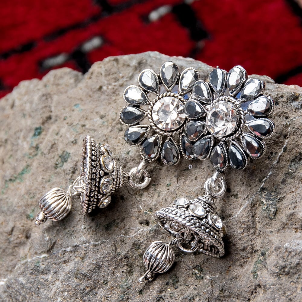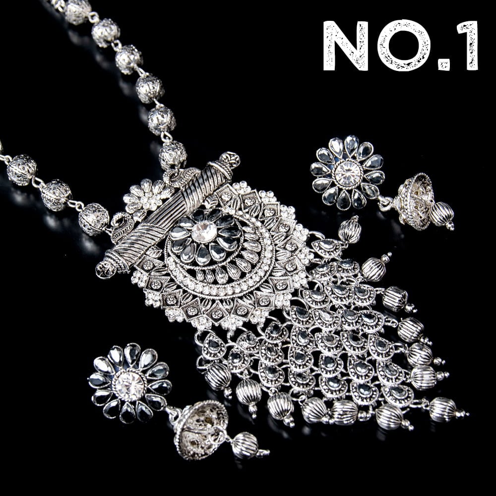 「インドのアクセサリーってゴージャスだけど、コーディネイトが難しくて…」とお悩みのあなたにオススメしたいのが、こちらのピアスとネックレスセットです。あらかじめ同じデザインで統一されているので、どういう風に組み合わせればいいのかと迷う必要は一切なし!トライバルな雰囲気が好きな方へオススメ。色鮮やかな衣装などへ合わせても、シルバー系の落ち着いた色合いが対比になって素敵です。