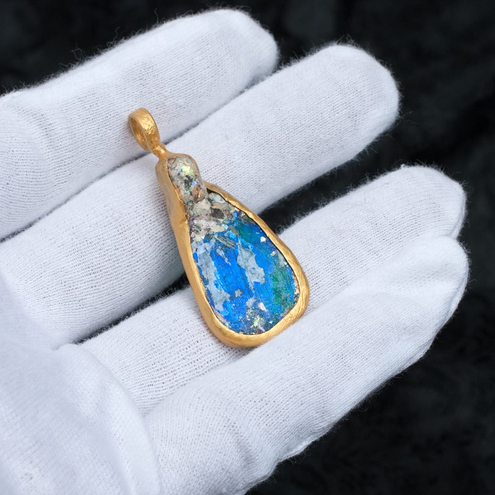ローマンガラスとは、はるか昔、ローマ帝政開始の紀元前27年から、ローマ帝国の東西分裂(紀元後後395年)までの約5世紀間に、ローマ帝国内で製造・流通したガラス製品です。こちらのペンダントトップになっているローマンガラスは、東西文化の交流地点であった中央アジアと南アジアの交差点で出土したものです。遙かローマから、駱駝の隊商に載せられて、長旅の後に中央アジアと南アジアの交差点にたどり着きました。ローマから運ばれたガラスは古代の人たちに使用されたあと、何らかの理由で土の下に眠ったのだと思われます。