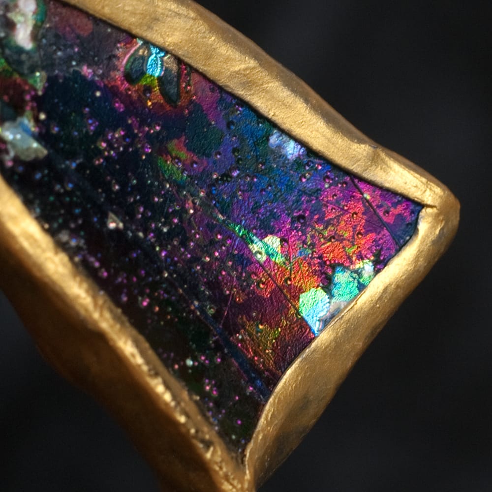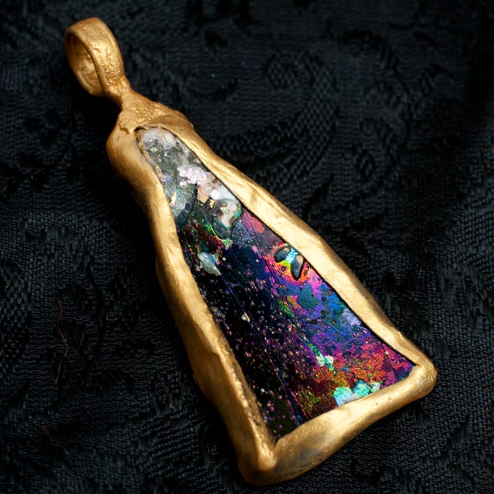 カラフルで星空の様な輝きを持つローマンガラスは、ローマ時代の人が使用したガラス製品が、遺物として土の下に埋まり、化学変化を起こして出来上がったものです。