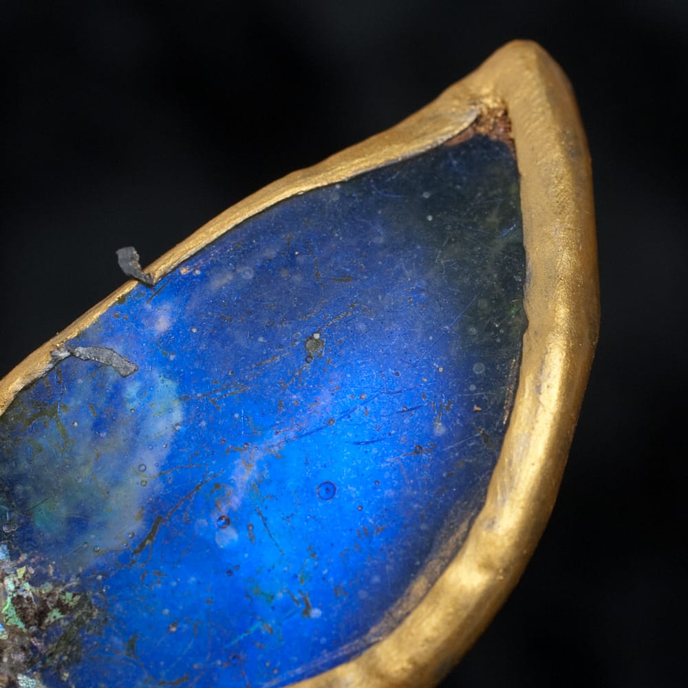 1000年、2000年もの間、土の中で眠り続けてきたガラスは、徐々に化学変化を起こし、その表面にキラキラとした光沢をまとうようになります。これは銀化と呼ばれる現象で、ガラス成分が土に含まれる銅や、鉄、マグネシウムなどの成分と長い時間の間に化学変化を起こします。土の中に埋蔵されている時間が長くなるにつれて、銀化した層が多くなり、色も多層に、光の反射も複雑になり、綺麗になっていきます。