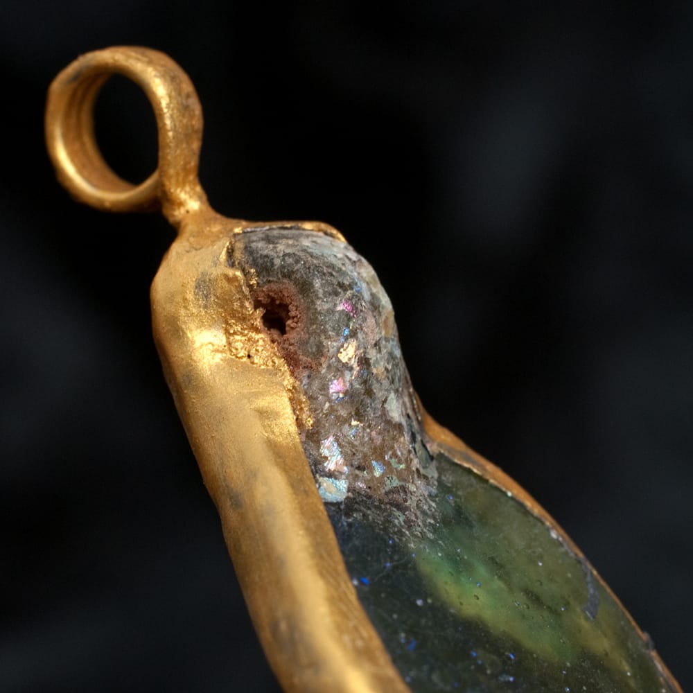 ローマンガラスとは、はるか昔、ローマ帝政開始の紀元前27年から、ローマ帝国の東西分裂(紀元後後395年)までの約5世紀間に、ローマ帝国内で製造・流通したガラス製品です。こちらのペンダントトップになっているローマンガラスは、東西文化の交流地点であった中央アジアと南アジアの交差点で出土したものです。遙かローマから、駱駝の隊商に載せられて、長旅の後に中央アジアと南アジアの交差点にたどり着きました。ローマから運ばれたガラスは古代の人たちに使用されたあと、何らかの理由で土の下に眠ったのだと思われます。