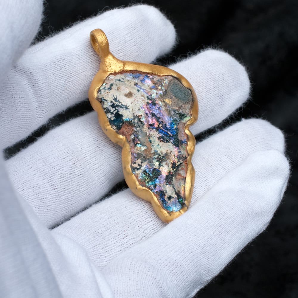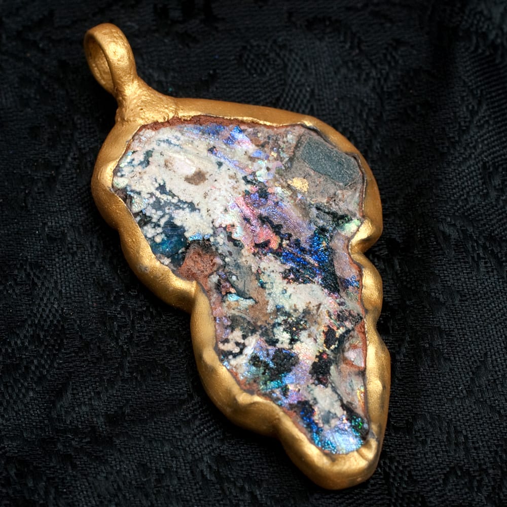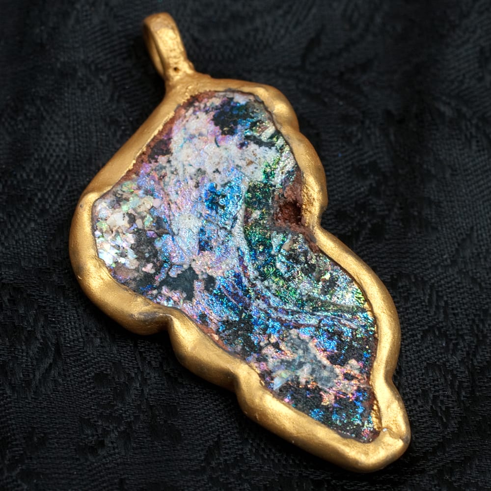 ローマンガラスとは、はるか昔、ローマ帝政開始の紀元前27年から、ローマ帝国の東西分裂(紀元後後395年)までの約5世紀間に、ローマ帝国内で製造・流通したガラス製品です。こちらのペンダントトップになっているローマンガラスは、東西文化の交流地点であった中央アジアと南アジアの交差点で出土したものです。遙かローマから、駱駝の隊商に載せられて、長旅の後に中央アジアと南アジアの交差点にたどり着きました。ローマから運ばれたガラスは古代の人たちに使用されたあと、何らかの理由で土の下に眠ったのだと思われます。