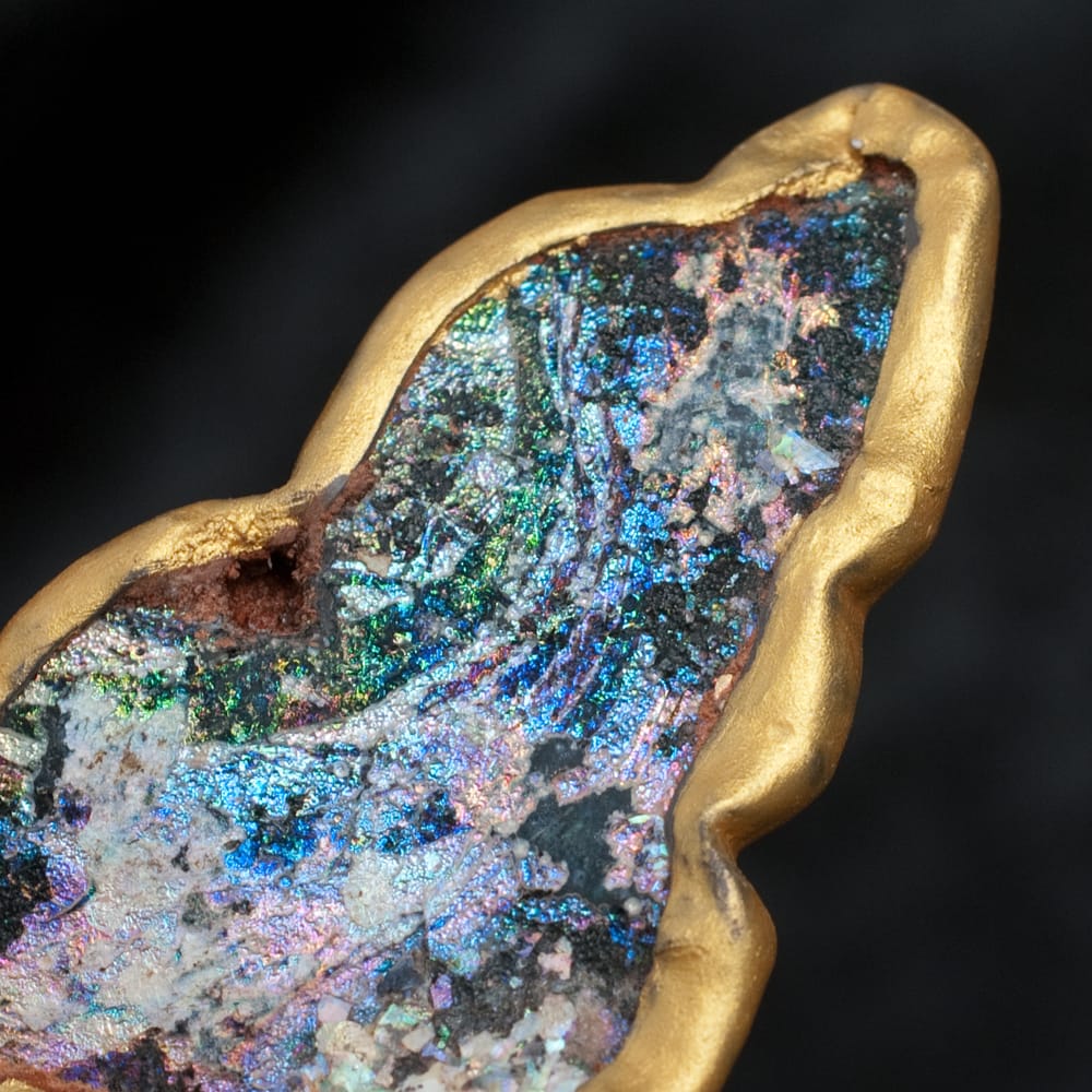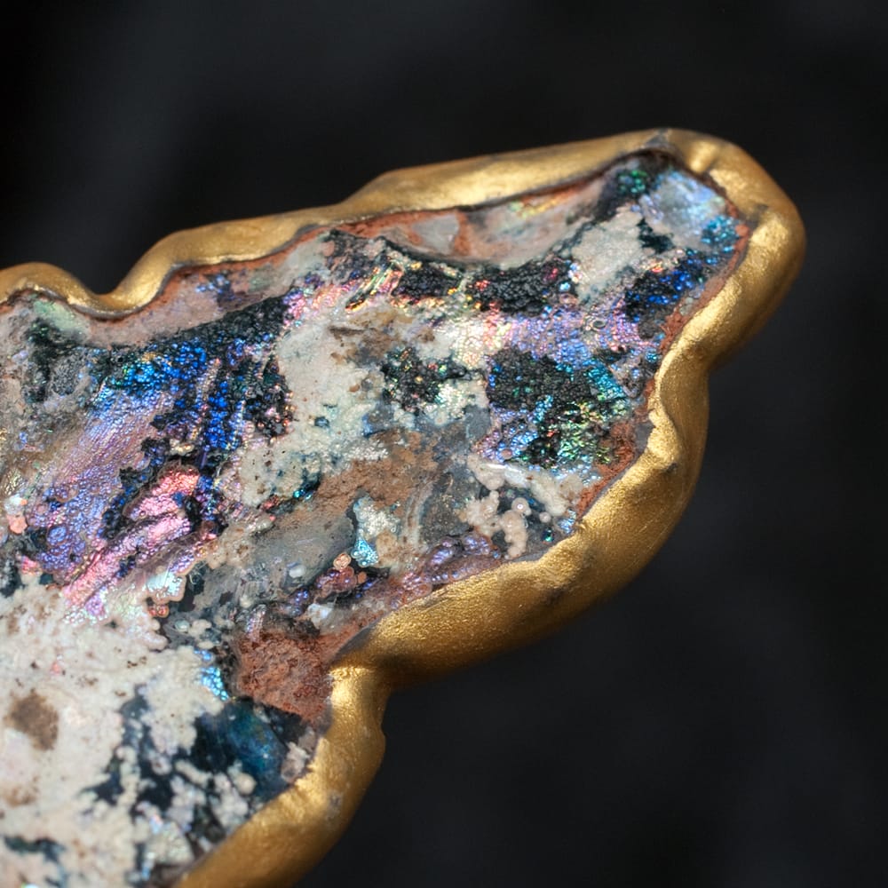 カラフルで星空の様な輝きを持つローマンガラスは、ローマ時代の人が使用したガラス製品が、遺物として土の下に埋まり、化学変化を起こして出来上がったものです。