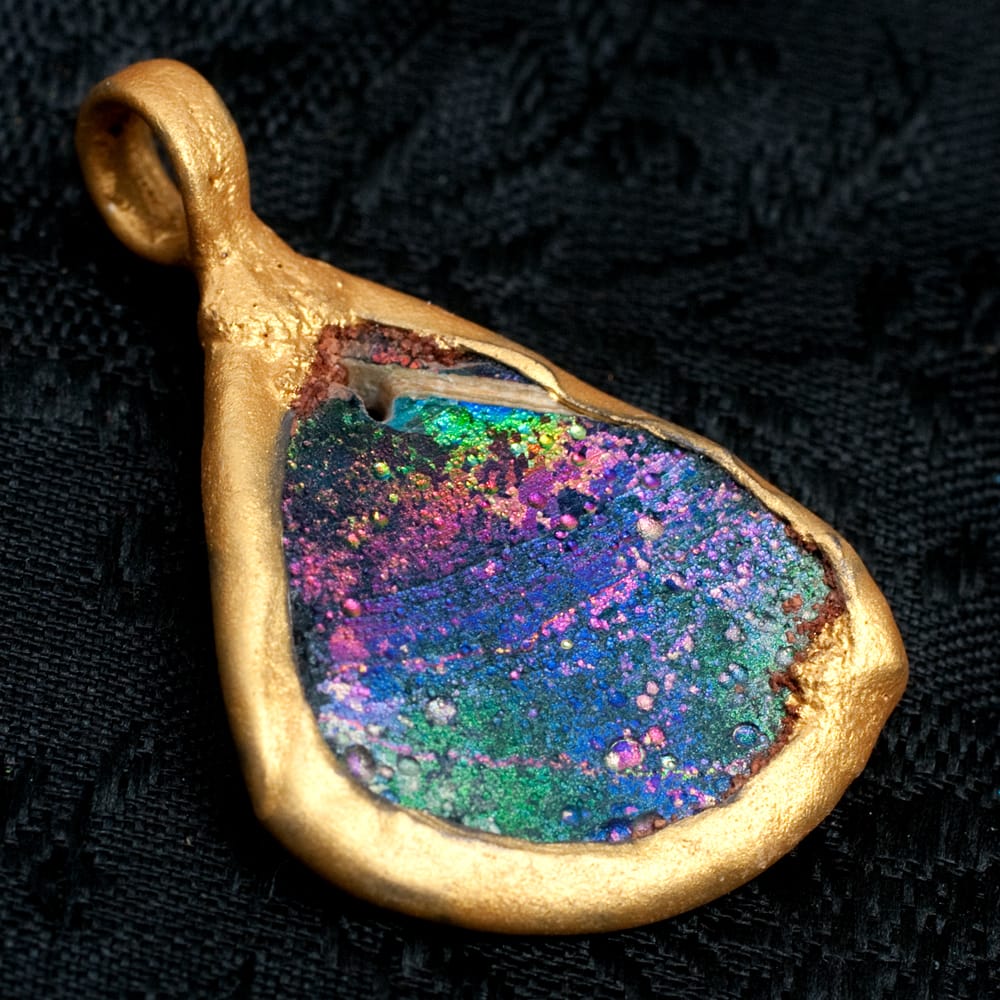 カラフルで星空の様な輝きを持つローマンガラスは、ローマ時代の人が使用したガラス製品が、遺物として土の下に埋まり、化学変化を起こして出来上がったものです。