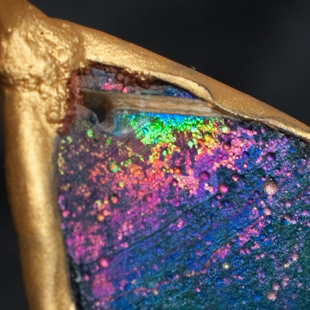 1000年、2000年もの間、土の中で眠り続けてきたガラスは、徐々に化学変化を起こし、その表面にキラキラとした光沢をまとうようになります。これは銀化と呼ばれる現象で、ガラス成分が土に含まれる銅や、鉄、マグネシウムなどの成分と長い時間の間に化学変化を起こします。土の中に埋蔵されている時間が長くなるにつれて、銀化した層が多くなり、色も多層に、光の反射も複雑になり、綺麗になっていきます。